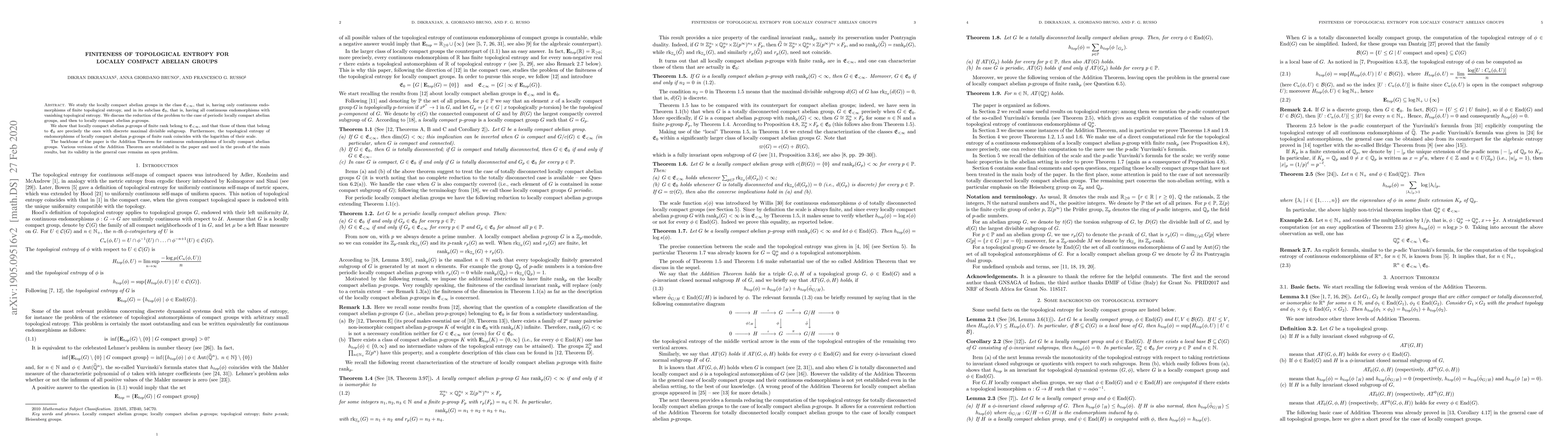 We study the locally compact abelian groups in the class $\mathfrak E_{<\infty}$, that is, having only continuous endomorphisms of finite topological entropy, and in its subclass $\mathfrak E_0$, that is, having all continuous endomorphisms with vanishing topological entropy. We discuss the reduction of the problem to the case of periodic locally compact abelian groups, and then to locally compact abelian $p$-groups. We show that locally compact abelian $p$-groups of finite rank belong to $\mathfrak E_{<\infty}$, and that those of them that belong to $\mathfrak E_0$ are precisely the ones with discrete maximal divisible subgroup. Furthermore, the topological entropy of endomorphisms of locally compact abelian $p$-groups of finite rank coincides with the logarithm of their scale. The backbone of the paper is the Addition Theorem for continuous endomorphisms of locally compact abelian groups. Various versions of the Addition Theorem are established in the paper and used in the proofs of the main results, but its validity in the general case remains an open problem.