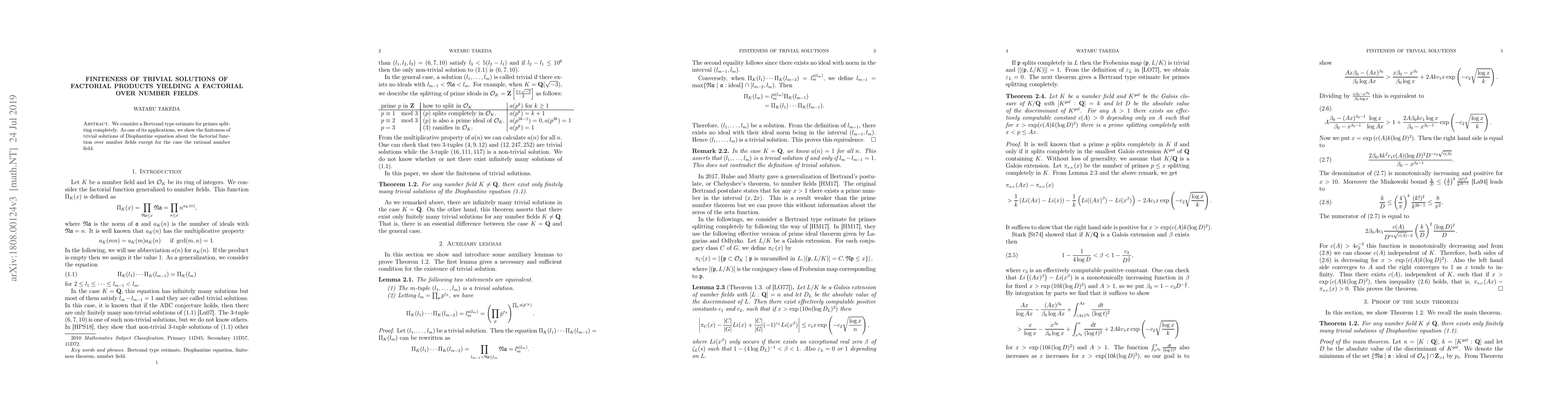 This paper proves the finiteness of trivial solutions for a Diophantine equation involving factorials over number fields, leveraging a Bertrand type estimate for primes that split completely, except for the rational number field.