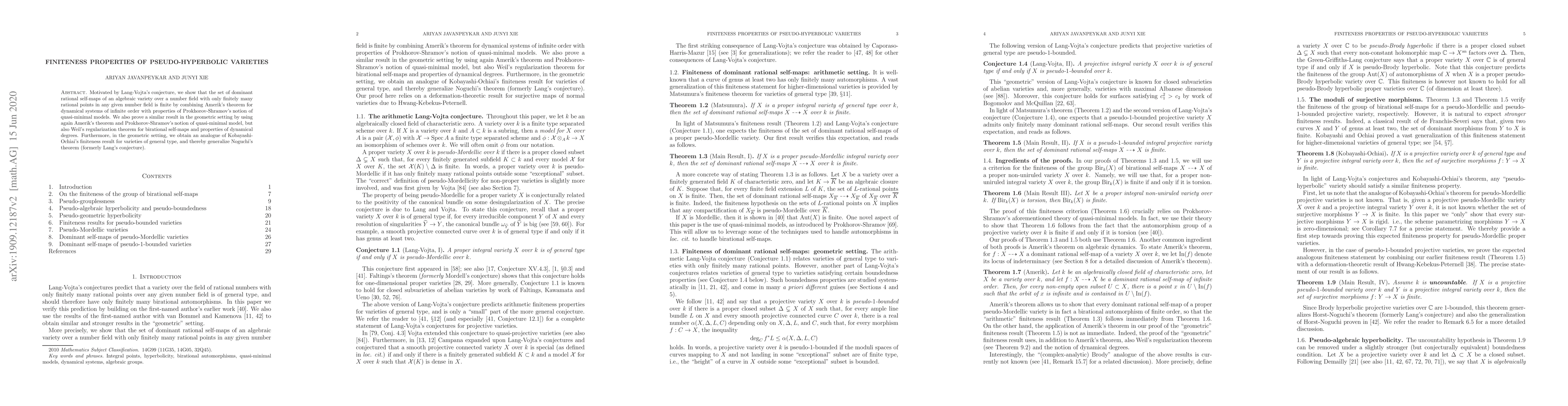 Motivated by Lang-Vojta's conjecture, we show that the set of dominant rational self-maps of an algebraic variety over a number field with only finitely many rational points in any given number field is finite by combining Amerik's theorem for dynamical systems of infinite order with properties of Prokhorov-Shramov's notion of quasi-minimal models. We also prove a similar result in the geometric setting by using again Amerik's theorem and Prokhorov-Shramov's notion of quasi-minimal model, but also Weil's regularization theorem for birational self-maps and properties of dynamical degrees. Furthermore, in the geometric setting, we obtain an analogue of Kobayashi-Ochiai's finiteness result for varieties of general type, and thereby generalize Noguchi's theorem (formerly Lang's conjecture).