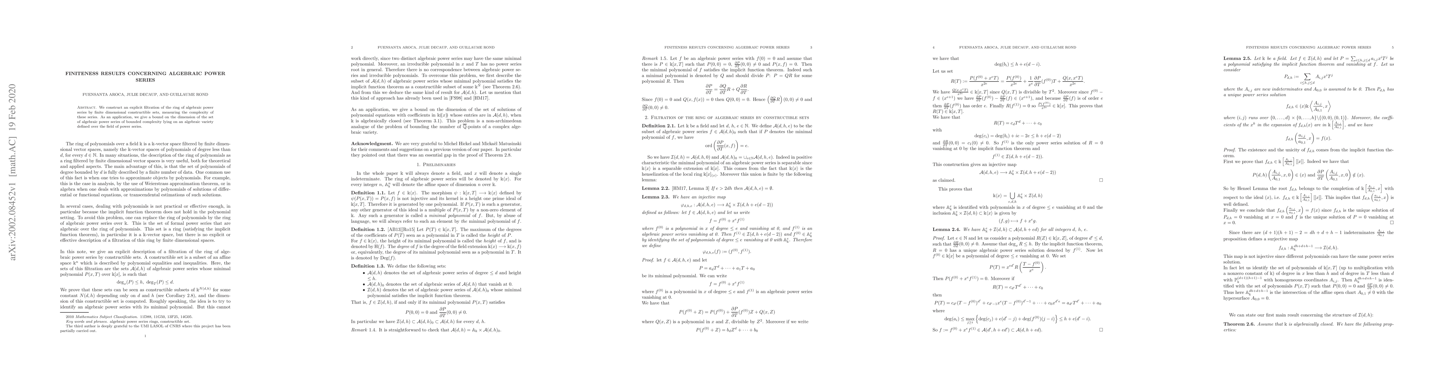 Summary: The paper constructs a filtration of the ring of algebraic power series using finite dimensional constructible sets to measure complexity, and applies this to derive a bound on the dimension of algebraic power series of bounded complexity on a given algebraic variety over the field of power series.