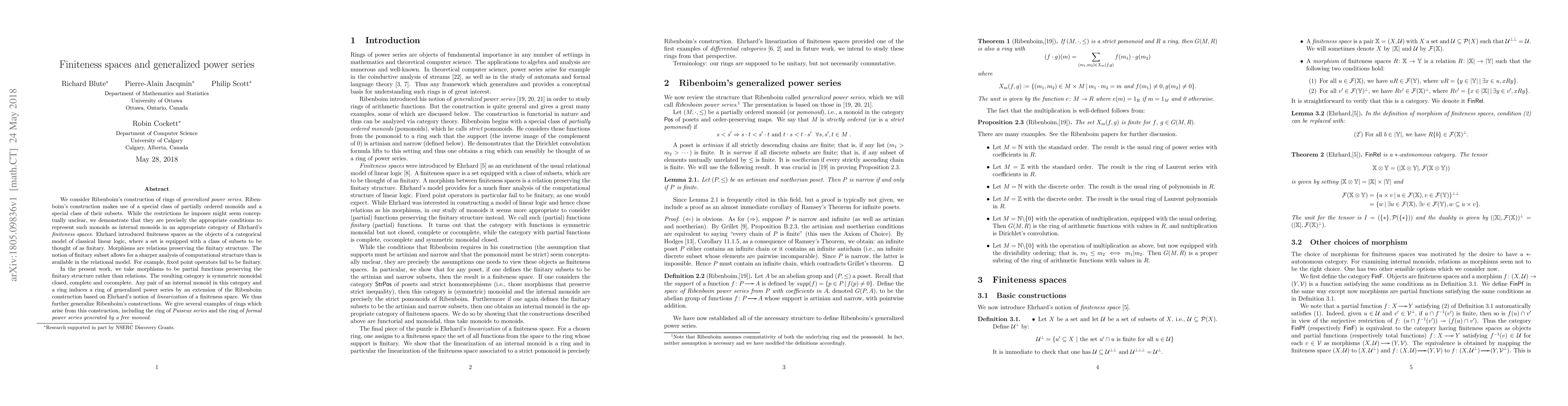 We consider Ribenboim's construction of rings of generalized power series. Ribenboim's construction makes use of a special class of partially ordered monoids and a special class of their subsets. While the restrictions he imposes might seem conceptually unclear, we demonstrate that they are precisely the appropriate conditions to represent such monoids as internal monoids in an appropriate category of Ehrhard's finiteness spaces. Ehrhard introduced finiteness spaces as the objects of a categorical model of classical linear logic, where a set is equipped with a class of subsets to be thought of as finitary. Morphisms are relations preserving the finitary structure. The notion of finitary subset allows for a sharper analysis of computational structure than is available in the relational model. For example, fixed point operators fail to be finitary. In the present work, we take morphisms to be partial functions preserving the finitary structure rather than relations. The resulting category is symmetric monoidal closed, complete and cocomplete. Any pair of an internal monoid in this category and a ring induces a ring of generalized power series by an extension of the Ribenboim construction based on Ehrhard's notion of linearization of a finiteness space. We thus further generalize Ribenboim's constructions. We give several examples of rings which arise from this construction, including the ring of Puiseux series and the ring of formal power series generated by a free monoid.