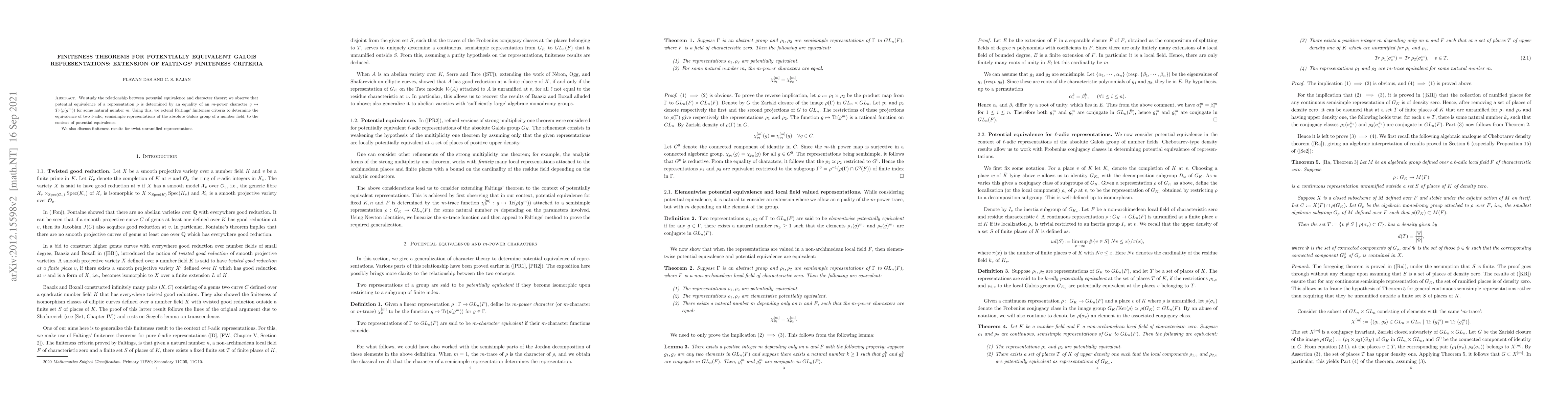 We study the relationship between potential equivalence and character theory; we observe that potential equivalence of a representation $\rho$ is determined by an equality of an $m$-power character $g\mapsto Tr(\rho(g^m))$ for some natural number $m$. Using this, we extend Faltings' finiteness criteria to determine the equivalence of two $\ell$-adic, semisimple representations of the absolute Galois group of a number field, to the context of potential equivalence. We also discuss finiteness results for twist unramified representations.