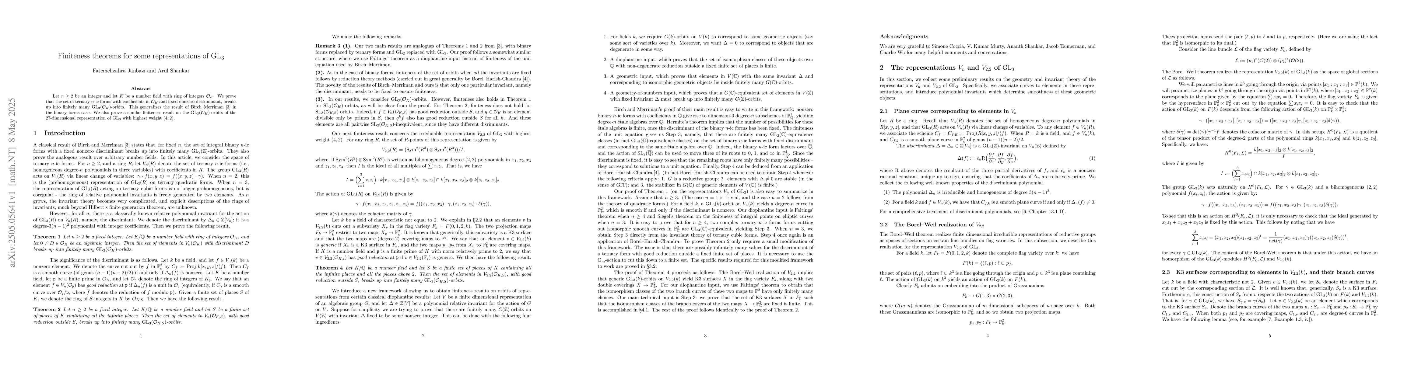 Let $n \geq 2$ be an integer and let $K$ be a number field with ring of integers $\mathcal{O}_K$. We prove that the set of ternary $n$-ic forms with coefficients in $\mathcal{O}_K$ and fixed nonzero discriminant, breaks up into finitely many $\mathrm{GL}_3(\mathcal{O}_K)$-orbits. This generalizes a result of Birch--Merriman in the binary forms case. We also prove a similar finiteness result on the $\mathrm{GL}_3(\mathcal{O}_K)$-orbits of the 27-dimensional representation of $\mathrm{GL}_3$ with highest weight $(4, 2)$.