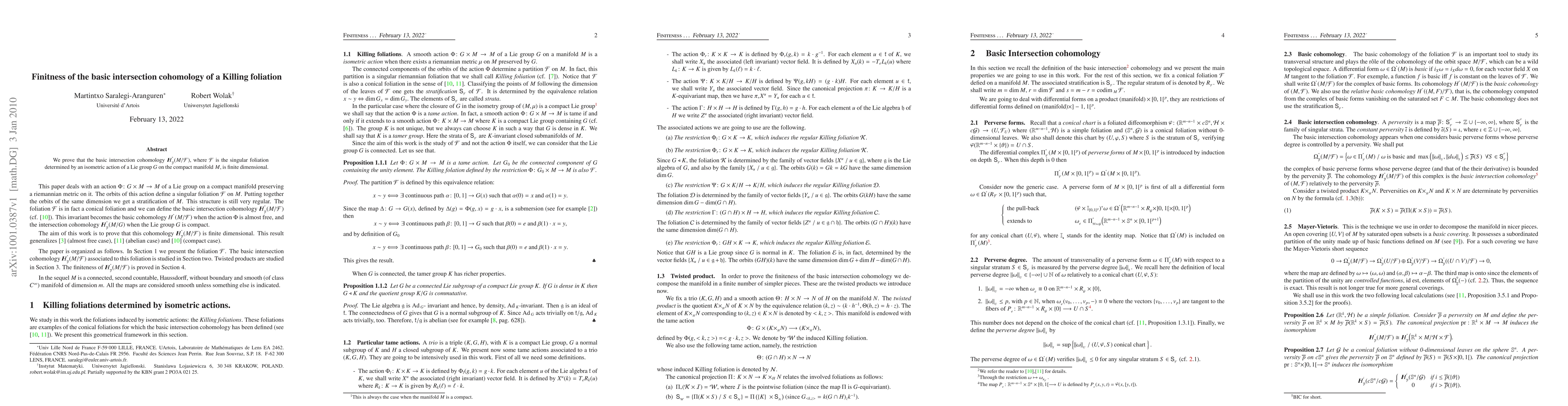 We prove that the basic intersection cohomology $ {I H}^{^{*}}_{_{\bar{p}}}{(M/\mathcal{F})}, $ where $\mathcal{F}$ is the singular foliation determined by an isometric action of a Lie group $G$ on the compact manifold $M$, is finite dimensional.