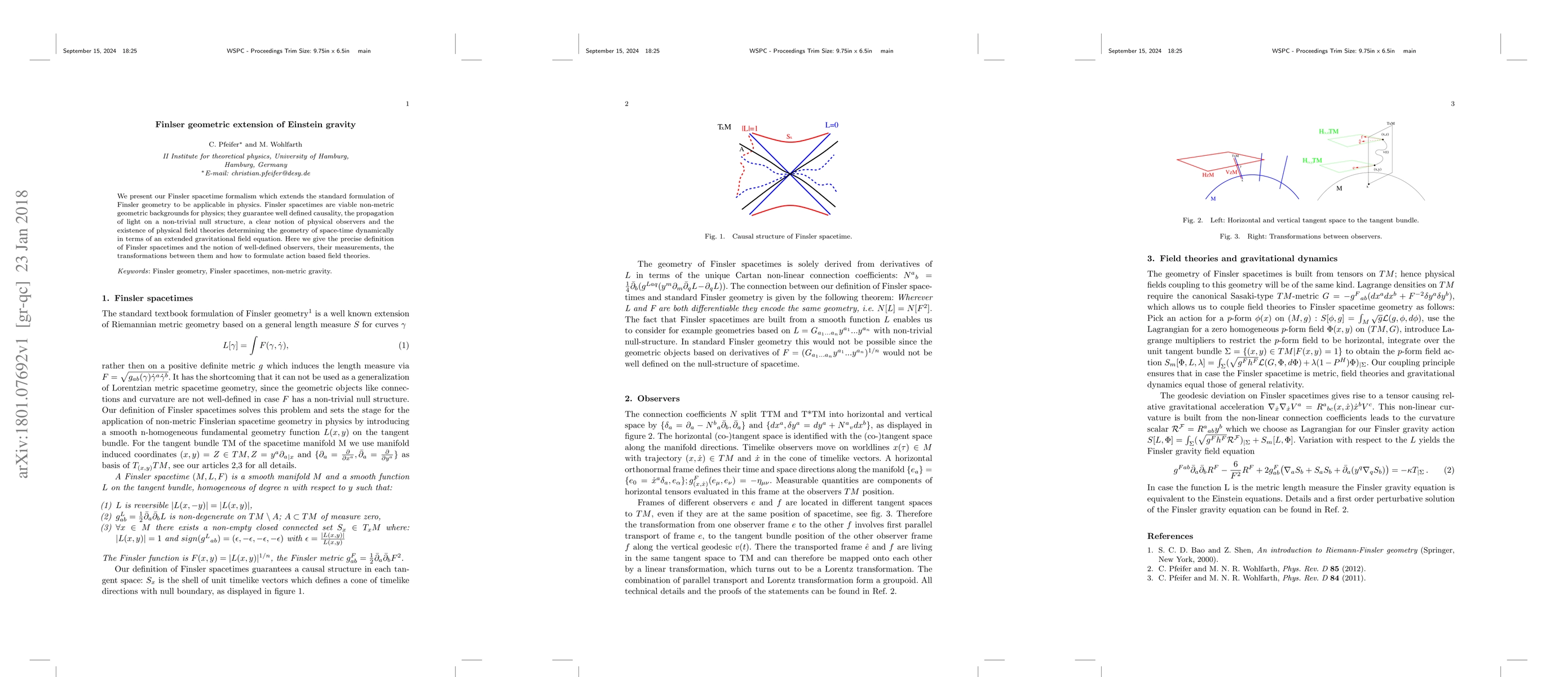 We present our Finsler spacetime formalism which extends the standard formulation of Finsler geometry to be applicable in physics. Finsler spacetimes are viable non-metric geometric backgrounds for physics; they guarantee well defined causality, the propagation of light on a non-trivial null structure, a clear notion of physical observers and the existence of physical field theories determining the geometry of space-time dynamically in terms of an extended gravitational field equation. Here we give the precise definition of Finsler spacetimes and the notion of well-defined observers, their measurements, the transformations between them and how to formulate action based field theories.