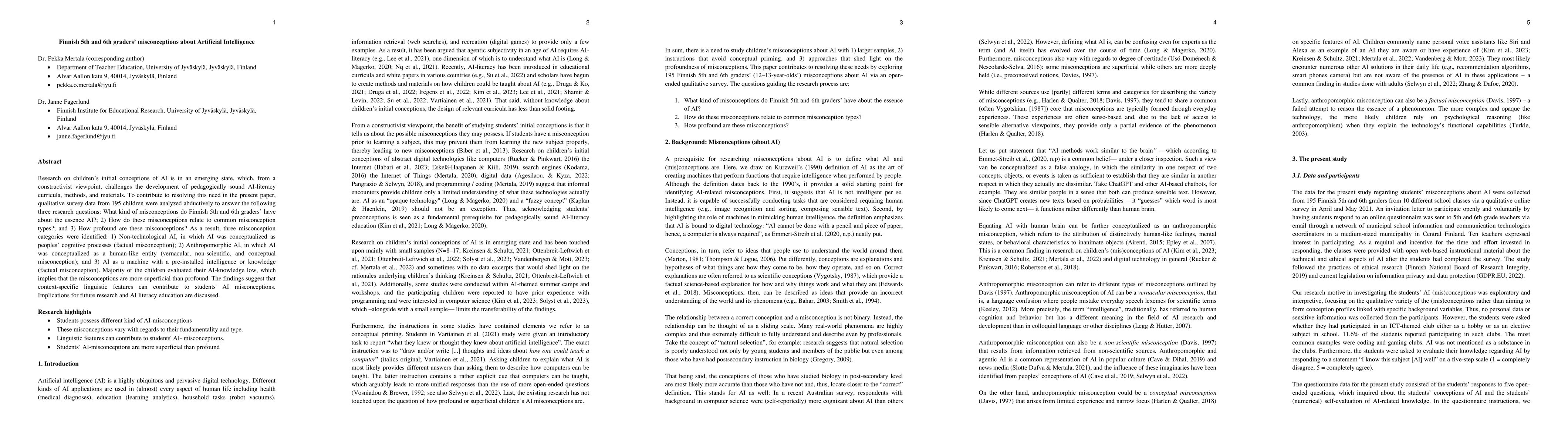 This study identifies misconceptions among Finnish 5th and 6th graders about AI, categorizing them into non-technological, anthropomorphic, and pre-installed intelligence views. The findings suggest these misconceptions are relatively superficial, highlighting the need for improved AI literacy education.