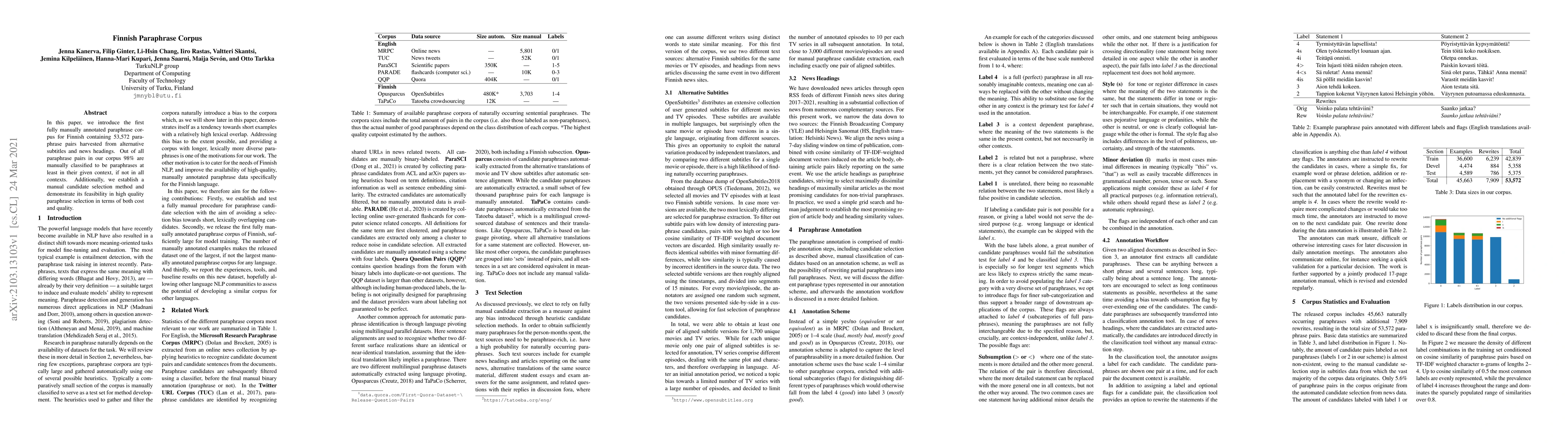 The Finnish Paraphrase Corpus presents a manually annotated dataset of 53,572 paraphrase pairs from subtitles and news, with 98% classified as contextually paraphrased. The study also introduces a cost-effective and high-quality candidate selection method for paraphrase identification.
