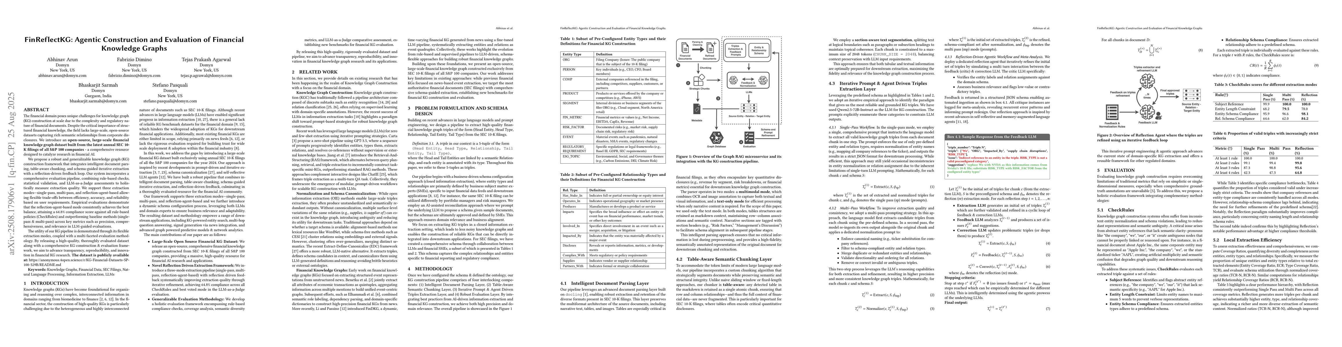 The financial domain poses unique challenges for knowledge graph (KG) construction at scale due to the complexity and regulatory nature of financial documents. Despite the critical importance of structured financial knowledge, the field lacks large-scale, open-source datasets capturing rich semantic relationships from corporate disclosures. We introduce an open-source, large-scale financial knowledge graph dataset built from the latest annual SEC 10-K filings of all S and P 100 companies - a comprehensive resource designed to catalyze research in financial AI. We propose a robust and generalizable knowledge graph (KG) construction framework that integrates intelligent document parsing, table-aware chunking, and schema-guided iterative extraction with a reflection-driven feedback loop. Our system incorporates a comprehensive evaluation pipeline, combining rule-based checks, statistical validation, and LLM-as-a-Judge assessments to holistically measure extraction quality. We support three extraction modes - single-pass, multi-pass, and reflection-agent-based - allowing flexible trade-offs between efficiency, accuracy, and reliability based on user requirements. Empirical evaluations demonstrate that the reflection-agent-based mode consistently achieves the best balance, attaining a 64.8 percent compliance score against all rule-based policies (CheckRules) and outperforming baseline methods (single-pass and multi-pass) across key metrics such as precision, comprehensiveness, and relevance in LLM-guided evaluations.
