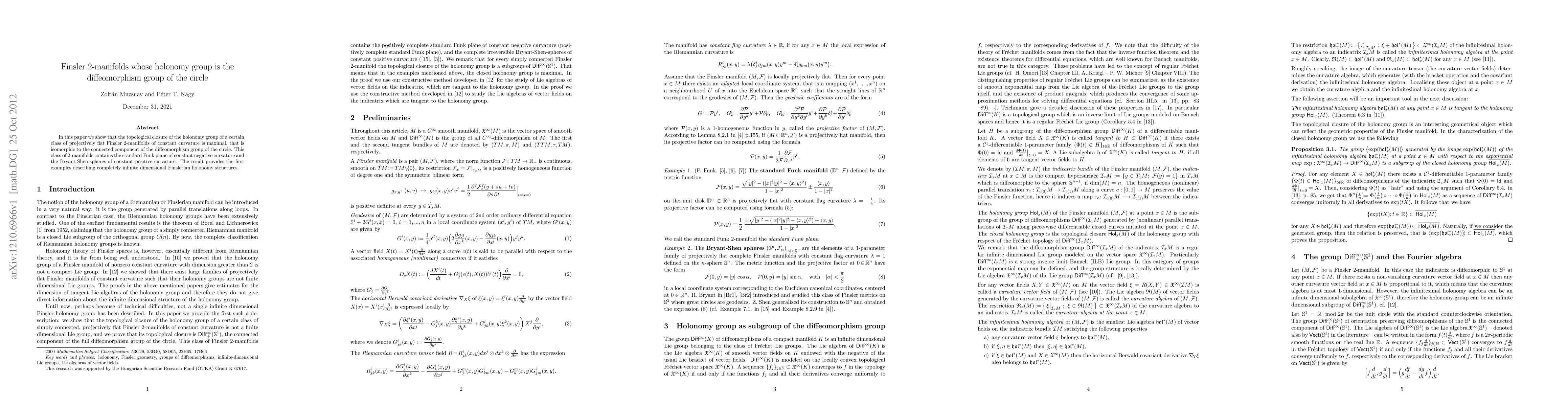 Summary: The paper establishes that certain projectively flat Finsler 2-manifolds with constant curvature have a topologically maximal holonomy group isomorphic to the connected component of the diffeomorphism group of the circle, offering the first examples of infinite-dimensional Finslerian holonomy structures. It includes notable examples like the Funk plane and Bryant-Shen-spheres.