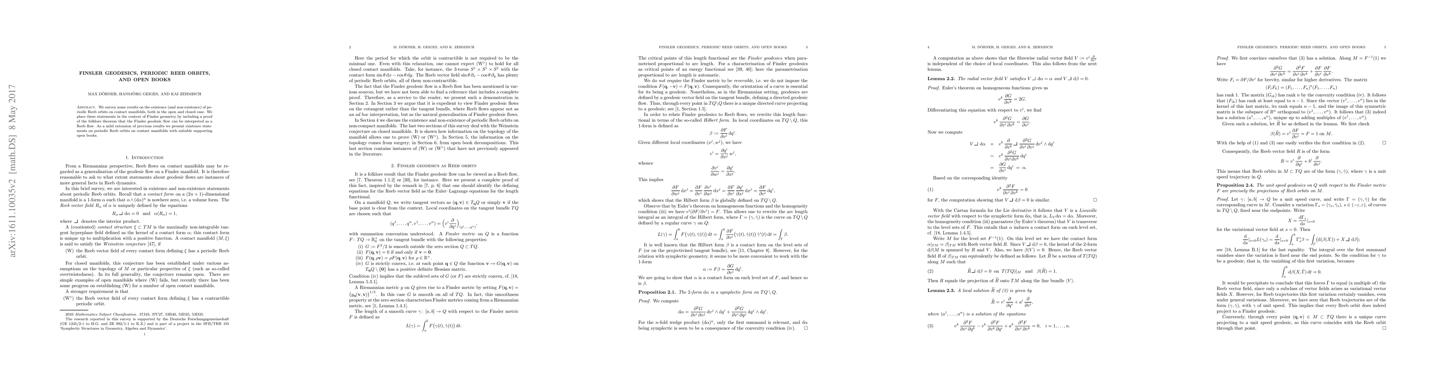 We survey some results on the existence (and non-existence) of periodic Reeb orbits on contact manifolds, both in the open and closed case. We place these statements in the context of Finsler geometry by including a proof of the folklore theorem that the Finsler geodesic flow can be interpreted as a Reeb flow. As a mild extension of previous results we present existence statements on periodic Reeb orbits on contact manifolds with suitable supporting open books.