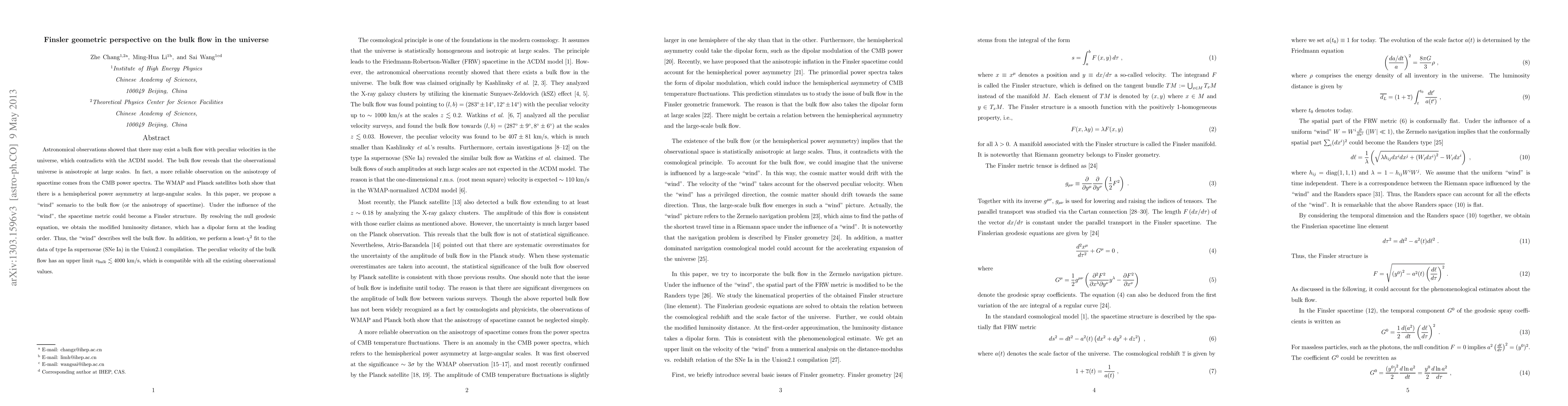 Astronomical observations showed that there may exist a bulk flow with peculiar velocities in the universe, which contradicts with the (\Lambda)CDM model. The bulk flow reveals that the observational universe is anisotropic at large scales. In fact, a more reliable observation on the anisotropy of spacetime comes from the CMB power spectra. The WMAP and Planck satellites both show that there is a hemispherical power asymmetry at large-angular scales. In this paper, we propose a "wind" scenario to the bulk flow (or the anisotropy of spacetime). Under the influence of the "wind", the spacetime metric could become a Finsler structure. By resolving the null geodesic equation, we obtain the modified luminosity distance, which has a dipolar form at the leading order. Thus, the "wind" describes well the bulk flow. In addition, we perform a least-(\chi^2) fit to the data of type Ia supernovae (SNe Ia) in the Union2.1 compilation. The peculiar velocity of the bulk flow has an upper limit (v_{bulk}\lesssim 4000 \rm{km/s}), which is compatible with all the existing observational values.