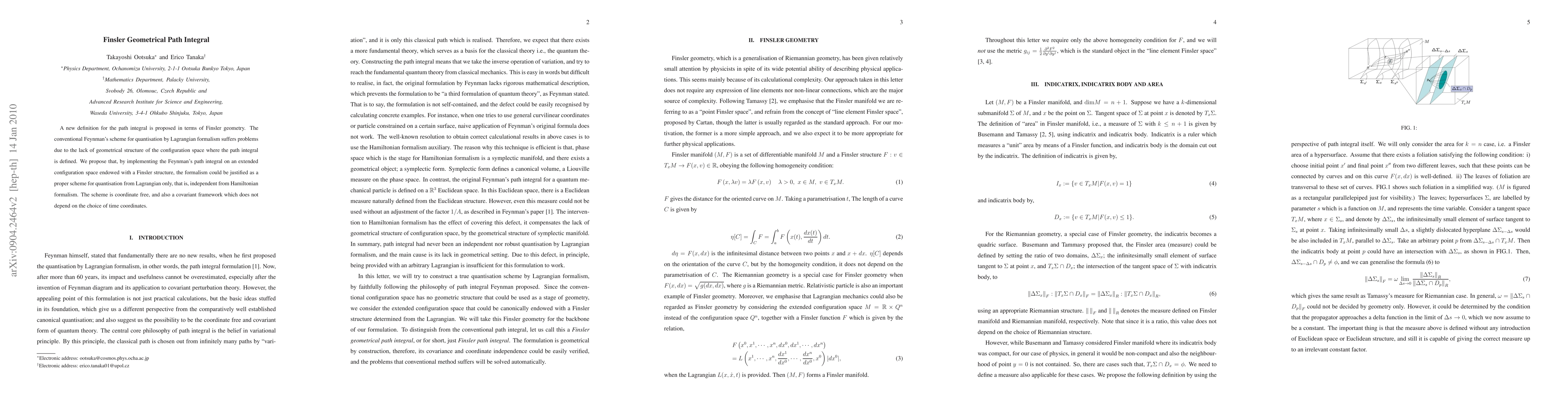 A new definition for the path integral is proposed in terms of Finsler geometry. The conventional Feynman's scheme for quantisation by Lagrangian formalism suffers problems due to the lack of geometrical structure of the configuration space where the path integral is defined. We propose that, by implementing the Feynman's path integral on an extended configuration space endowed with a Finsler structure, the formalism could be justified as a proper scheme for quantisation from Lagrangian only, that is, independent from Hamiltonian formalism. The scheme is coordinate free, and also a covariant framework which does not depend on the choice of time coordinate.