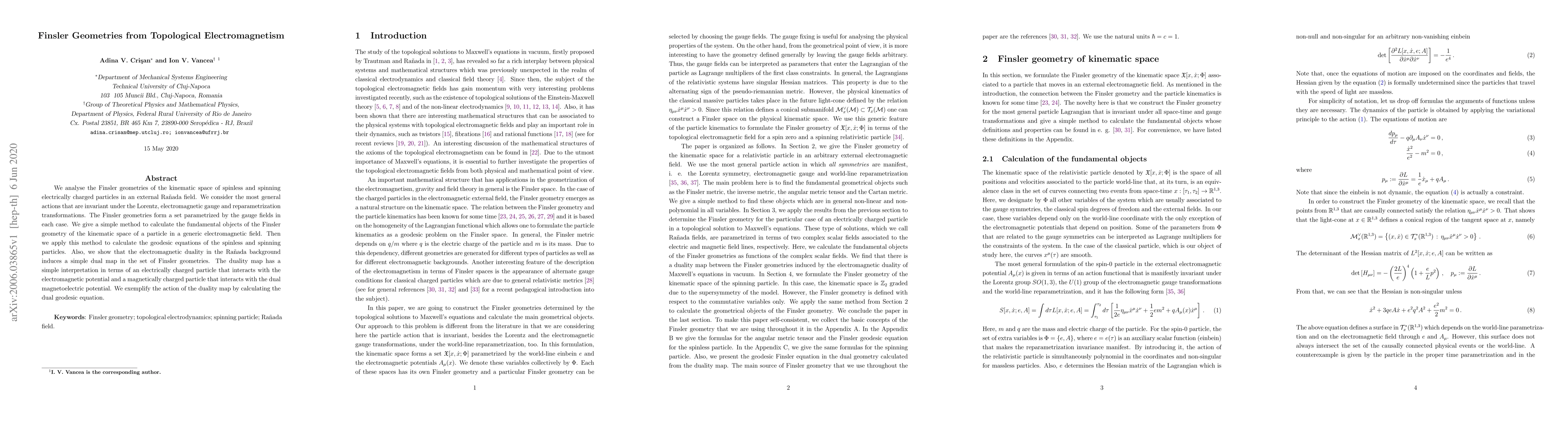 We analyse the Finsler geometries of the kinematic space of spinless and spinning electrically charged particles in an external Ra\~{n}ada field. We consider the most general actions that are invariant under the Lorentz, electromagnetic gauge and reparametrization transformations. The Finsler geometries form a set parametrized by the gauge fields in each case. We give a simple method to calculate the fundamental objects of the Finsler geometry of the kinematic space of a particle in a generic electromagnetic field. Then we apply this method to calculate the geodesic equations of the spinless and spinning particles. Also, we show that the electromagnetic duality in the Ra\~{n}ada background induces a simple dual map in the set of Finsler geometries. The duality map has a simple interpretation in terms of an electrically charged particle that interacts with the electromagnetic potential and a magnetically charged particle that interacts with the dual magnetoelectric potential. We exemplify the action of the duality map by calculating the dual geodesic equation.