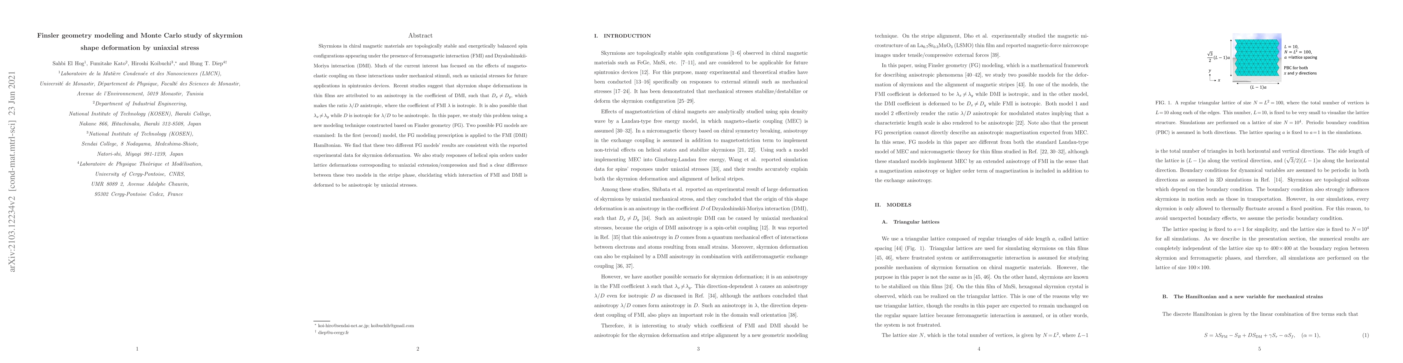 Skyrmions in chiral magnetic materials are topologically stable and energetically balanced spin configurations appearing under the presence of ferromagnetic interaction (FMI) and Dzyaloshinskii-Moriya interaction (DMI). Much of the current interest has focused on the effects of magneto-elastic coupling on these interactions under mechanical stimuli, such as uniaxial stresses for future applications in spintronics devices. Recent studies suggest that skyrmion shape deformations in thin films are attributed to an anisotropy in the coefficient of DMI, such that $D_{x}\!\not=\!D_{y}$, which makes the ratio $\lambda/D$ anistropic, where the coefficient of FMI $\lambda$ is isotropic. It is also possible that $\lambda_{x}\!\not=\!\lambda_{y}$ while $D$ is isotropic for $\lambda/D$ to be anisotropic. In this paper, we study this problem using a new modeling technique constructed based on Finsler geometry (FG). Two possible FG models are examined: In the first (second) model, the FG modeling prescription is applied to the FMI (DMI) Hamiltonian. We find that these two different FG models' results are consistent with the reported experimental data for skyrmion deformation. We also study responses of helical spin orders under lattice deformations corresponding to uniaxial extension/compression and find a clear difference between these two models in the stripe phase, elucidating which interaction of FMI and DMI is deformed to be anisotropic by uniaxial stresses.