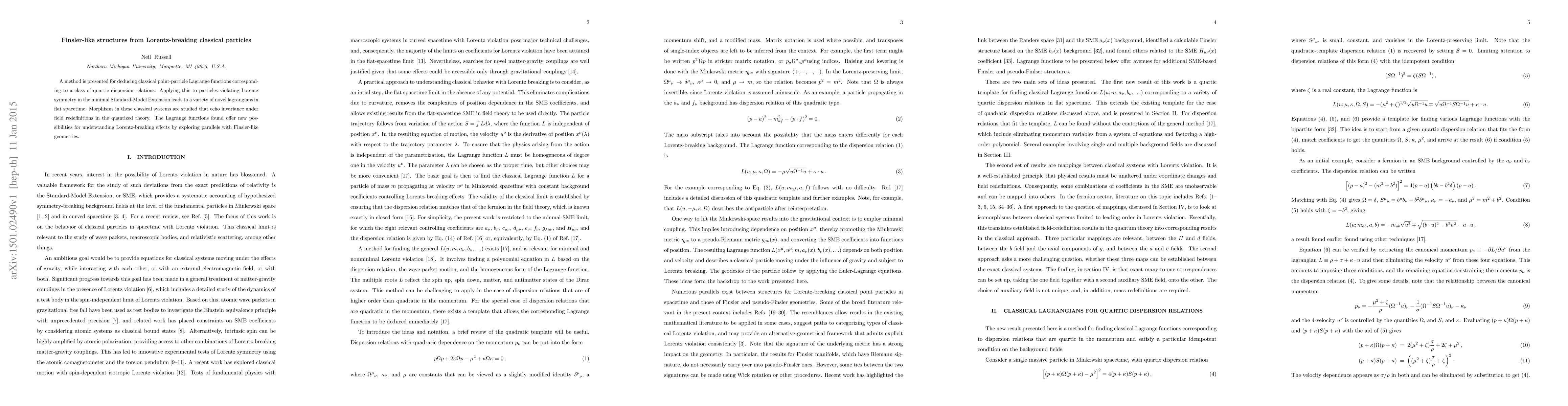 A method is presented for deducing classical point-particle Lagrange functions corresponding to a class of quartic dispersion relations. Applying this to particles violating Lorentz symmetry in the minimal Standard-Model Extension leads to a variety of novel lagrangians in flat spacetime. Morphisms in these classical systems are studied that echo invariance under field redefinitions in the quantized theory. The Lagrange functions found offer new possibilities for understanding Lorentz-breaking effects by exploring parallels with Finsler-like geometries.
