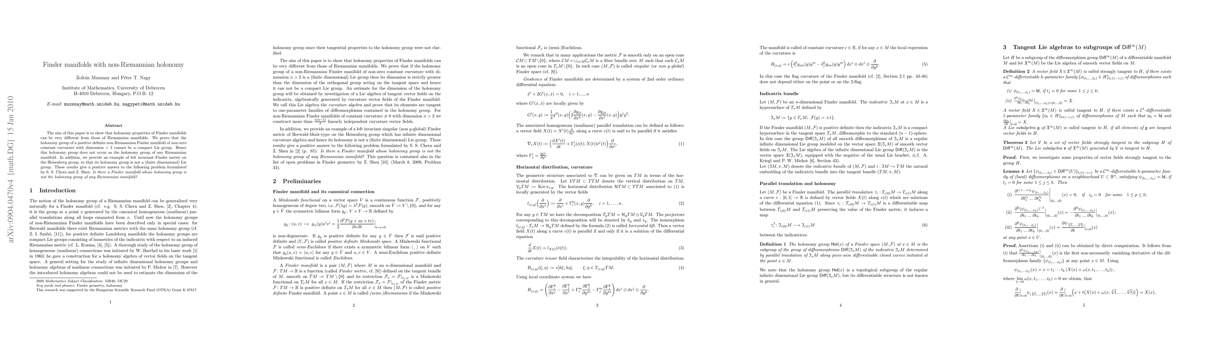 The paper introduces new techniques for analyzing holonomy groups in Finsler manifolds and provides a concrete example of a non-Lie holonomy group.