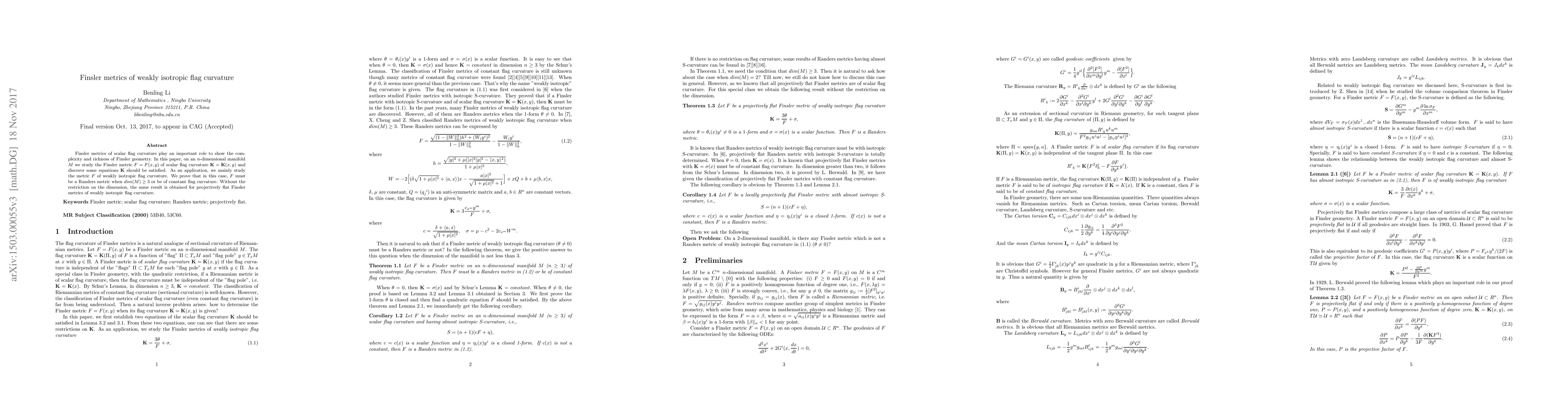 This paper investigates Finsler metrics with scalar flag curvature on an $n$-dimensional manifold, focusing on metrics of weakly isotropic flag curvature. It proves that such metrics are Randers metrics when the dimension is at least three and extends this result to projectively flat Finsler metrics without dimension restrictions.