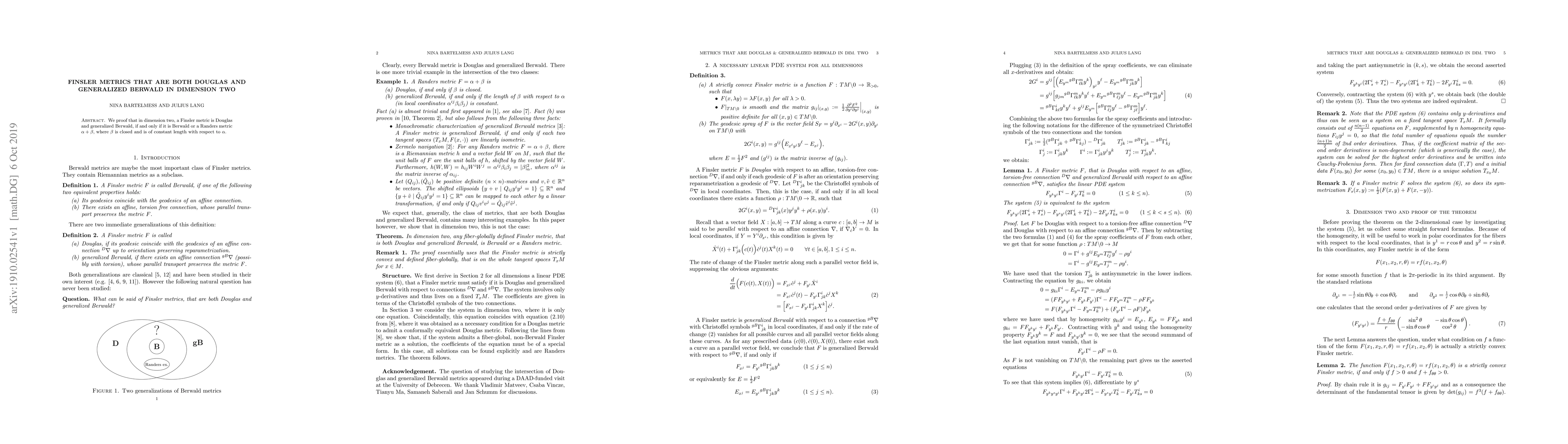 Summary: In two dimensions, a Finsler metric is both Douglas and generalized Berwald if and only if it is either a Berwald metric or a Randers metric of the form $\alpha + \beta$ with $\beta$ being a closed, constant-length vector field. This establishes a precise equivalence between these geometric structures in the specified dimension.