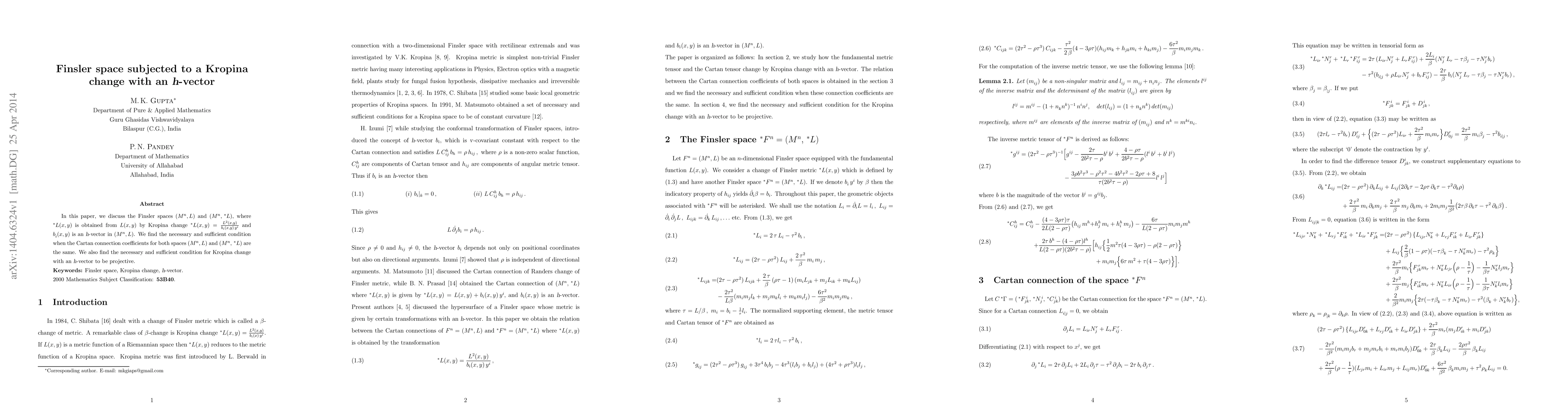 The paper presents detailed mathematical proofs and derivations for conditions under which Cartan connection coefficients of Finsler spaces remain unchanged and for identifying when Kropina transformations with an $h$-vector are projective.