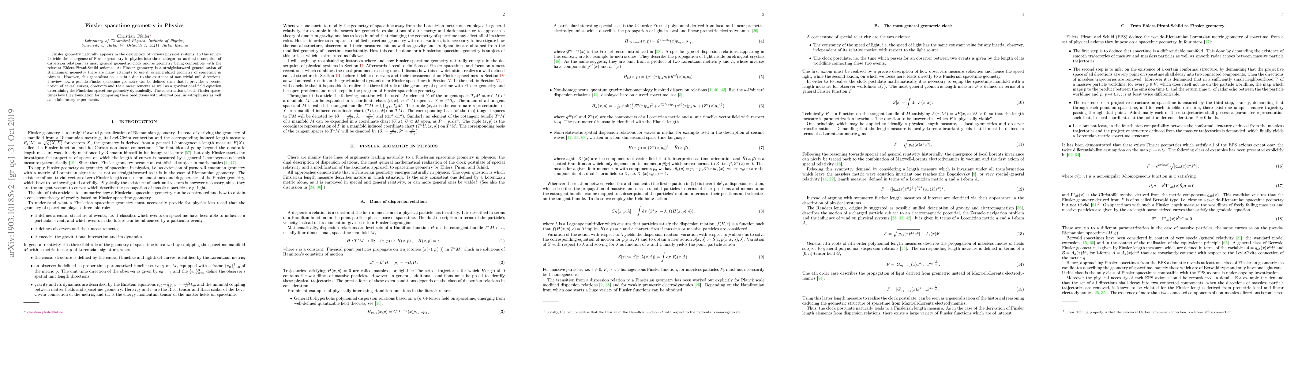 This paper reviews the emergence of Finsler geometry in physics, categorizing its applications in dual descriptions of dispersion relations, as a general geometric clock, and in relation to the Ehlers-Pirani-Schild axioms. It explores the construction of pseudo-Finsler spacetimes to define causal curves, observers, and dynamic gravitational fields, laying the groundwork for observational comparisons in astrophysics and laboratory experiments.