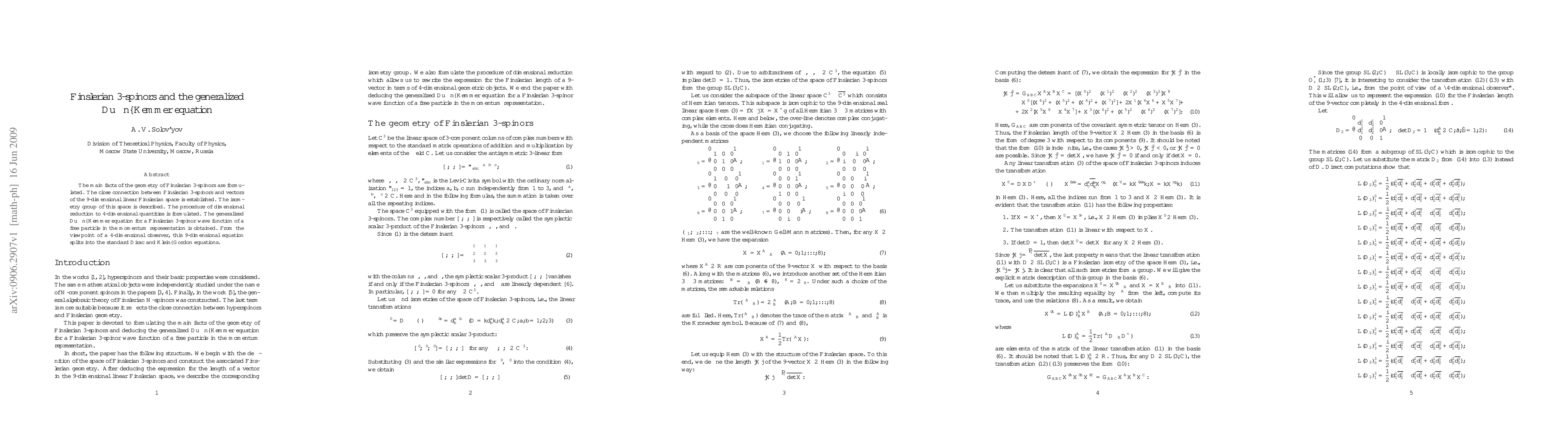 This paper explores the geometry of Finslerian 3-spinors, establishing their connection to vectors in a 9-dimensional linear Finslerian space and describing its isometry group. It also derives the generalized Duffin-Kemmer equation for a free particle, which reduces to the Dirac and Klein-Gordon equations in 4 dimensions.