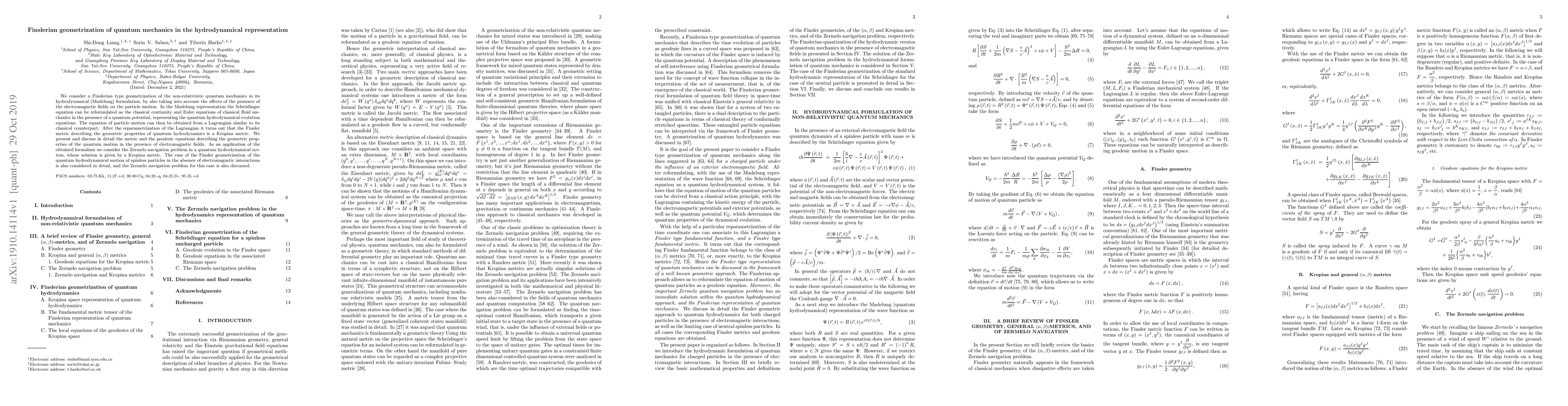 We consider a Finslerian type geometrization of the non-relativistic quantum mechanics in its hydrodynamical (Madelung) formulation, by also taking into account the effects of the presence of the electromagnetic fields on the particle motion. In the Madelung representation the Schr\"{o}dinger equation can be reformulated as the classical continuity and Euler equations of classical fluid mechanics in the presence of a quantum potential, representing the quantum hydrodynamical evolution equations. The equation of particle motion can then be obtained from a Lagrangian similar to its classical counterpart. After the reparametrization of the Lagrangian it turns out that the Finsler metric describing the geometric properties of quantum hydrodynamics is a Kropina metric. We present and discuss in detail the metric and the geodesic equations describing the geometric properties of the quantum motion in the presence of electromagnetic fields. As an application of the obtained formalism we consider the Zermelo navigation problem in a quantum hydrodynamical system, whose solution is given by a Kropina metric. The case of the Finsler geometrization of the quantum hydrodynamical motion of spinless particles in the absence of electromagnetic interactions is considered in detail, and the Zermelo navigation problem for this case is also discussed.
