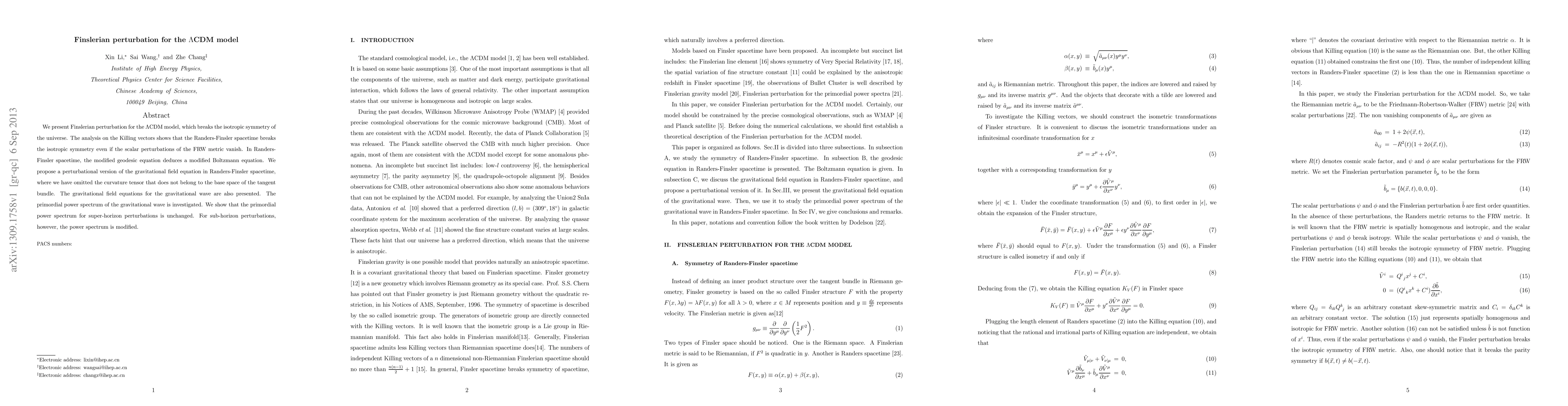 We present Finslerian perturbation for the $\Lambda$CDM model, which breaks the isotropic symmetry of the universe. The analysis on the Killing vectors shows that the Randers-Finsler spacetime breaks the isotropic symmetry even if the scalar perturbations of the FRW metric vanish. In Randers-Finsler spacetime, the modified geodesic equation deduces a modified Boltzmann equation. We propose a perturbational version of the gravitational field equation in Randers-Finsler spacetime, where we have omitted the curvature tensor that does not belong to the base space of the tangent bundle. The gravitational field equations for the gravitational wave are also presented. The primordial power spectrum of the gravitational wave is investigated. We show that the primordial power spectrum for super-horizon perturbations is unchanged. For sub-horizon perturbations, however, the power spectrum is modified.