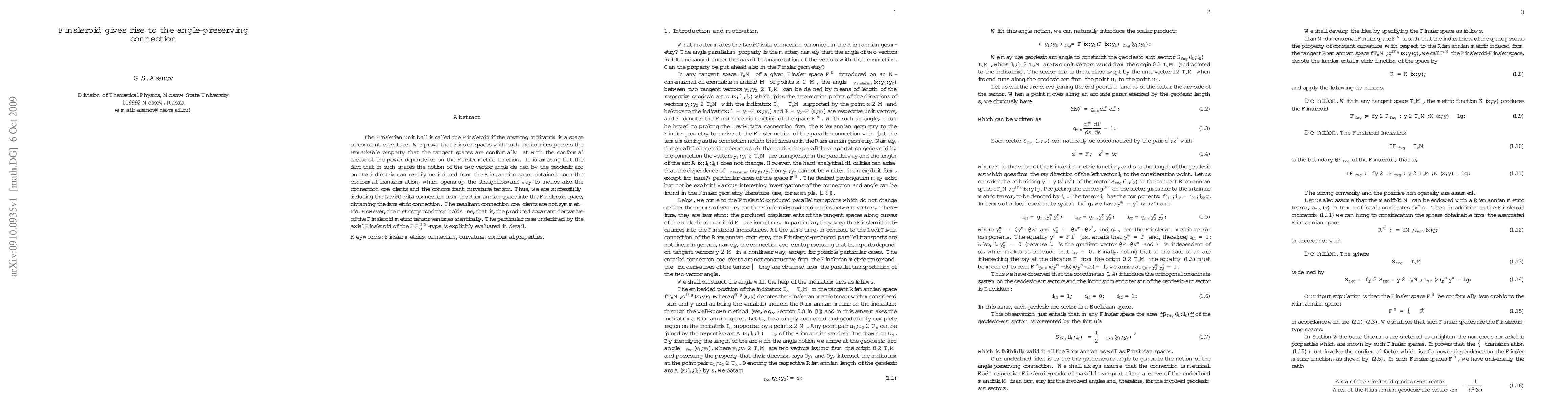 The Finslerian unit ball is called the {\it Finsleroid} if the covering indicatrix is a space of constant curvature. We prove that Finsler spaces with such indicatrices possess the remarkable property that the tangent spaces are conformally flat with the conformal factor of the power dependence on the Finsler metric function. It is amazing but the fact that in such spaces the notion of the two-vector angle defined by the geodesic arc on the indicatrix can readily be induced from the Riemannian space obtained upon the conformal transformation, which opens up the straightforward way to induce also the connection coefficients and the concomitant curvature tensor. Thus, we are successfully inducing the Levi-Civita connection from the Riemannian space into the Finsleroid space, obtaining the isometric connection. The resultant connection coefficients are not symmetric. However, the metricity condition holds fine, that is, the produced covariant derivative of the Finsleroid metric tensor vanishes identically. The particular case underlined by the axial Finsleroid of the ${\mathbf\cF\cF^{PD}_{g}}$-type is explicitly evaluated in detail. Keywords: Finsler metrics, connection, curvature, conformal properties.