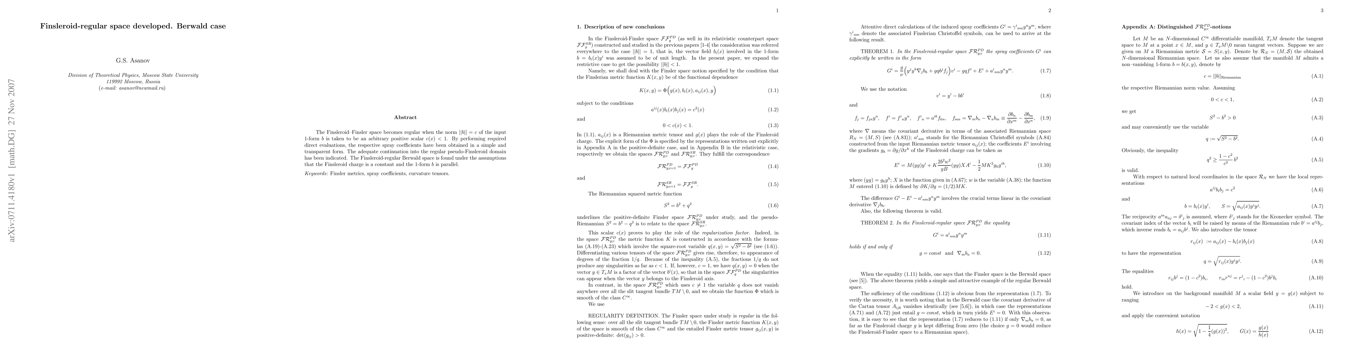 The Finsleroid--Finsler space becomes regular when the norm $||b||=c$ of the input 1-form $b$ is taken to be an arbitrary positive scalar $c(x) < 1$. By performing required direct evaluations, the respective spray coefficients have been obtained in a simple and transparent form. The adequate continuation into the regular pseudo-Finsleroid domain has been indicated. The Finsleroid-regular Berwald space is found under the assumptions that the Finsleroid charge is a constant and the 1-form $b$ is parallel. Keywords: Finsler metrics, spray coefficients, curvature tensors.