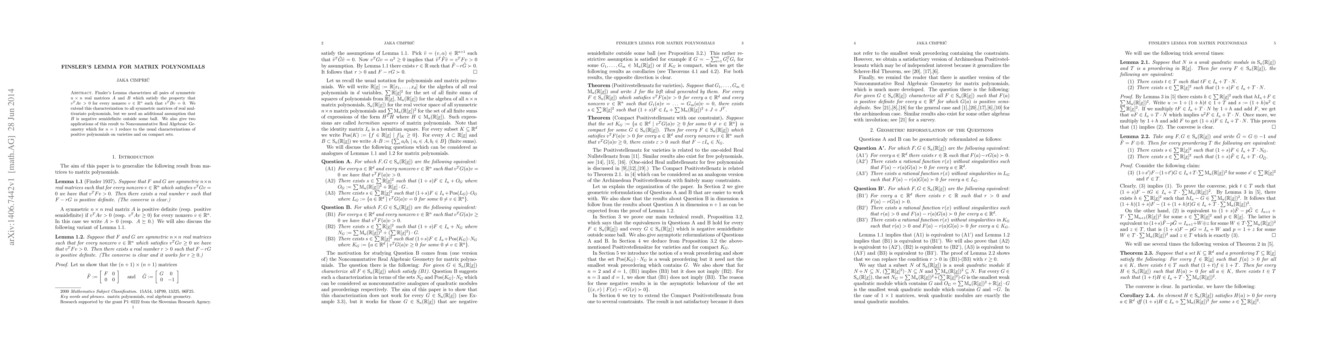 Finsler's Lemma is extended to characterize pairs of symmetric matrix polynomials satisfying $v^T A v > 0$ for all nonzero $v$ orthogonal to $v^T B v$, with an additional assumption on $B$'s negativity outside a certain region. Applications are provided to Noncommutative Real Algebraic Geometry.