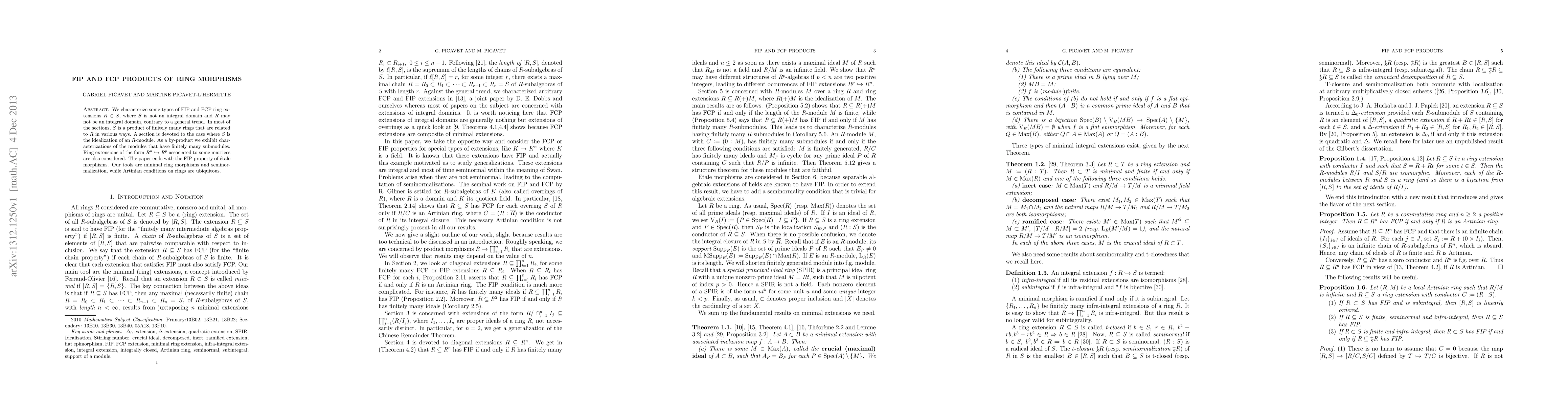 We characterize some types of FIP and FCP ring extensions $R \subset S$, where $S$ is not an integral domain and $R$ may not be an integral domain. In this paper S is mostly a product of rings related to R and also the idealization of an R-module.