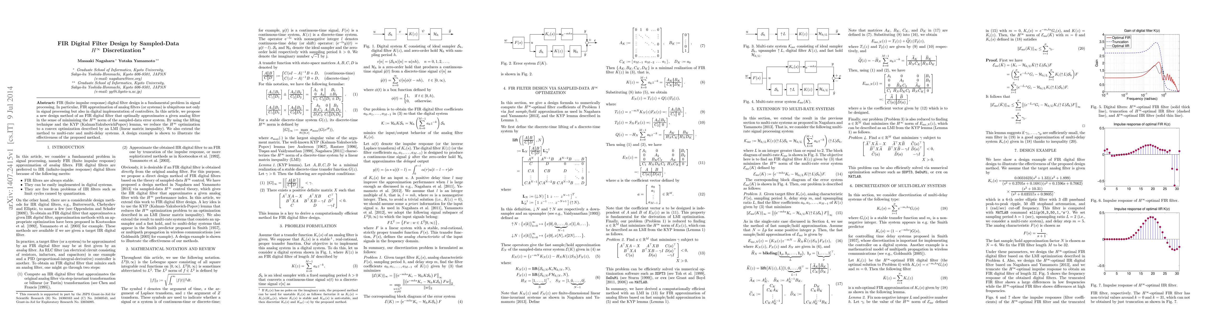 FIR (finite impulse response) digital filter design is a fundamental problem in signal processing. In particular, FIR approximation of analog filters (or systems) is ubiquitous not only in signal processing but also in digital implementation of controllers. In this article, we propose a new design method of an FIR digital filter that optimally approximates a given analog filter in the sense of minimizing the H-infinity norm of the sampled-data error system. By using the lifting technique and the KYP (Kalman-Yakubovich-Popov) lemma, we reduce the H-infinity optimization to a convex optimization described by an LMI (linear matrix inequality). We also extend the method to multi-rate and multi-delay systems. A design example is shown to illustrate the effectiveness of the proposed method.