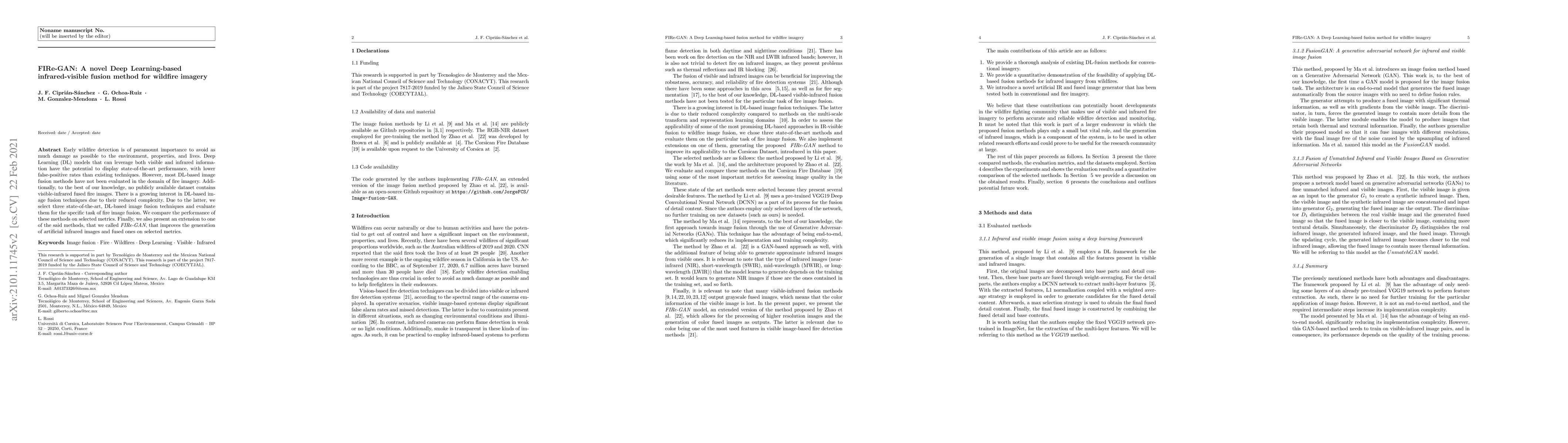 This paper introduces FIRe-GAN, a novel deep learning method for fusing infrared and visible imagery to enhance wildfire detection, aiming to reduce false-positive rates. The study evaluates existing deep learning fusion techniques for fire imagery and proposes an improved version of GAN-based fusion for better performance.