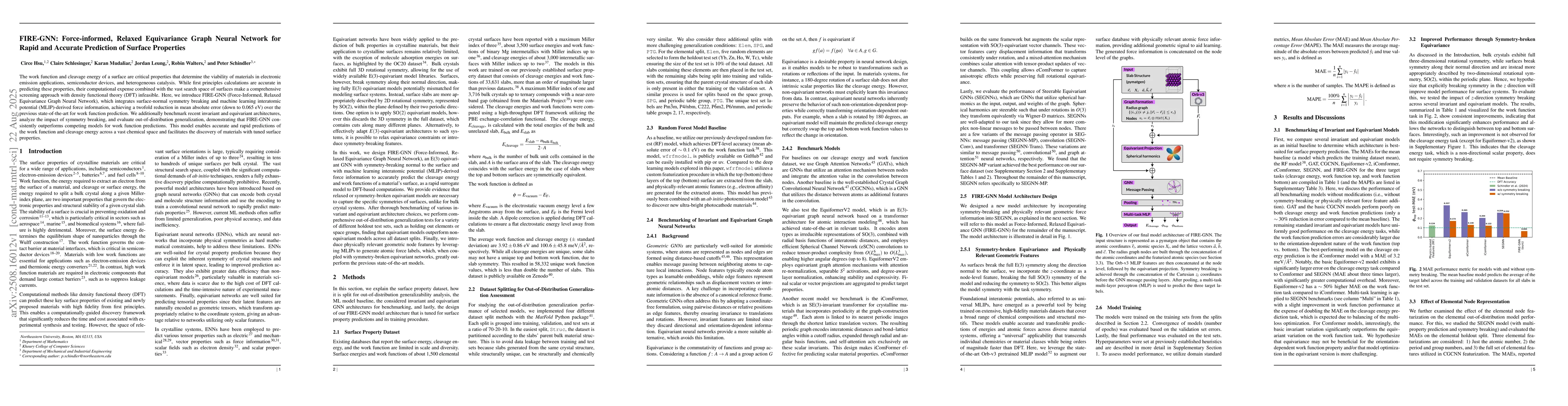 The work function and cleavage energy of a surface are critical properties that determine the viability of materials in electronic emission applications, semiconductor devices, and heterogeneous catalysis. While first principles calculations are accurate in predicting these properties, their computational expense combined with the vast search space of surfaces make a comprehensive screening approach with density functional theory (DFT) infeasible. Here, we introduce FIRE-GNN (Force-Informed, Relaxed Equivariance Graph Neural Network), which integrates surface-normal symmetry breaking and machine learning interatomic potential (MLIP)-derived force information, achieving a twofold reduction in mean absolute error (down to 0.065 eV) over the previous state-of-the-art for work function prediction. We additionally benchmark recent invariant and equivariant architectures, analyze the impact of symmetry breaking, and evaluate out-of-distribution generalization, demonstrating that FIRE-GNN consistently outperforms competing models for work function predictions. This model enables accurate and rapid predictions of the work function and cleavage energy across a vast chemical space and facilitates the discovery of materials with tuned surface properties
