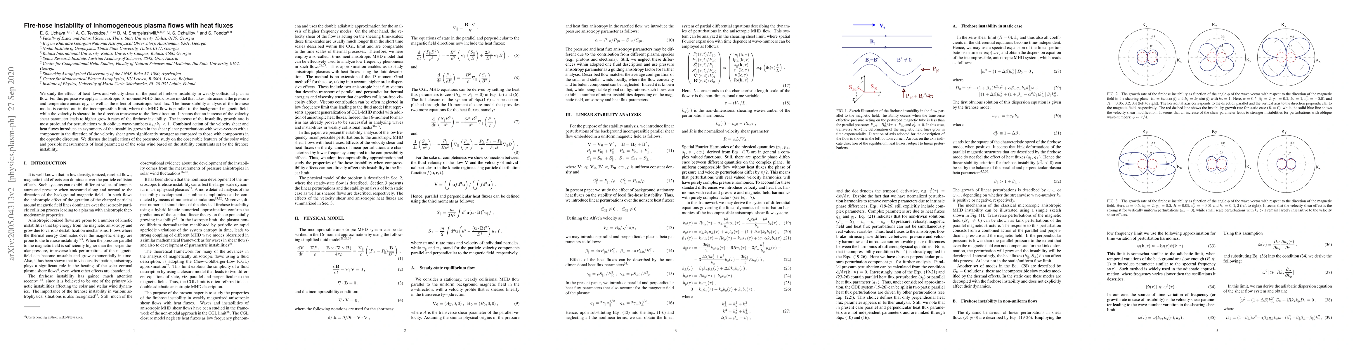 This study investigates the firehose instability in weakly collisional plasma flows with heat fluxes and velocity shear using an anisotropic 16-moments MHD model. Results show that higher velocity shear and heat flux parameters significantly increase the instability growth rate, especially for oblique wave-number perturbations.