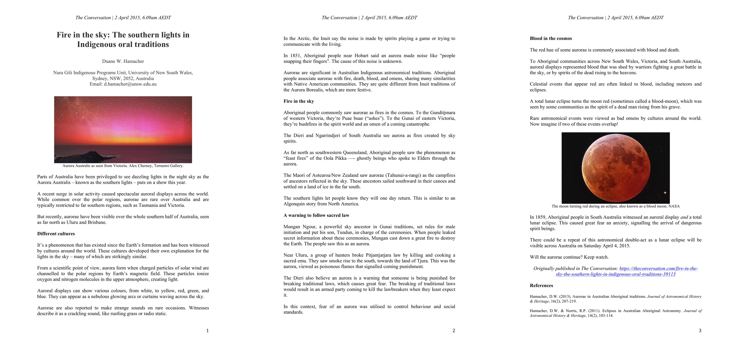 Summary: This paper explores the cultural significance of the Aurora Australis (southern lights) in Australian Indigenous oral traditions, where they are associated with fire, death, blood, and omens, mirroring similar interpretations found in Native American communities.