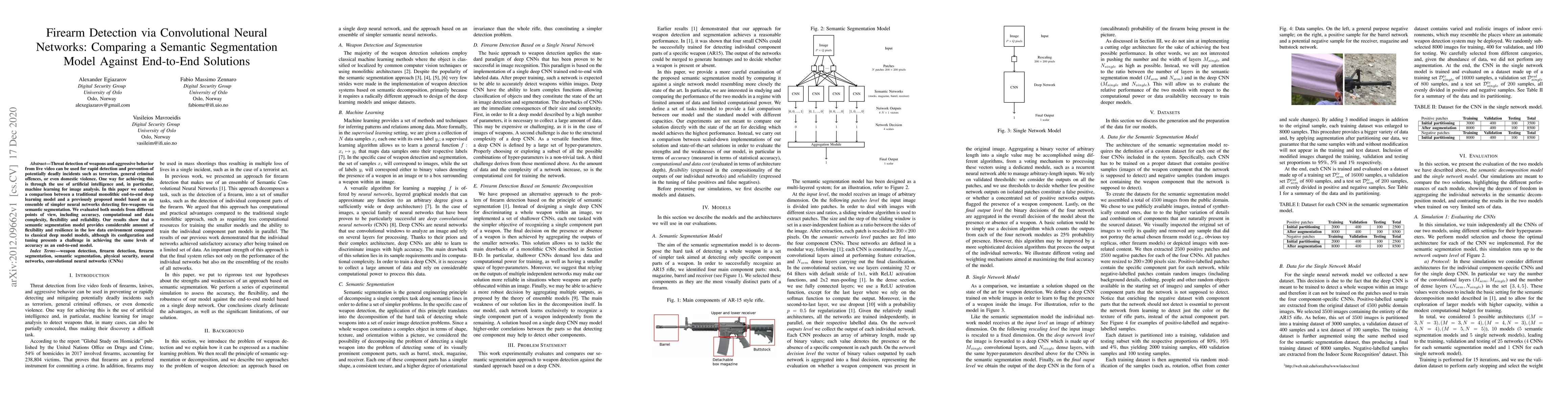 This paper compares a semantic segmentation model with an end-to-end deep learning model for firearm detection in live video, finding that the segmentation model offers greater flexibility and resilience in low data environments, though it lags in accuracy. The study evaluates both models based on accuracy, computational and data complexity, flexibility, and reliability.