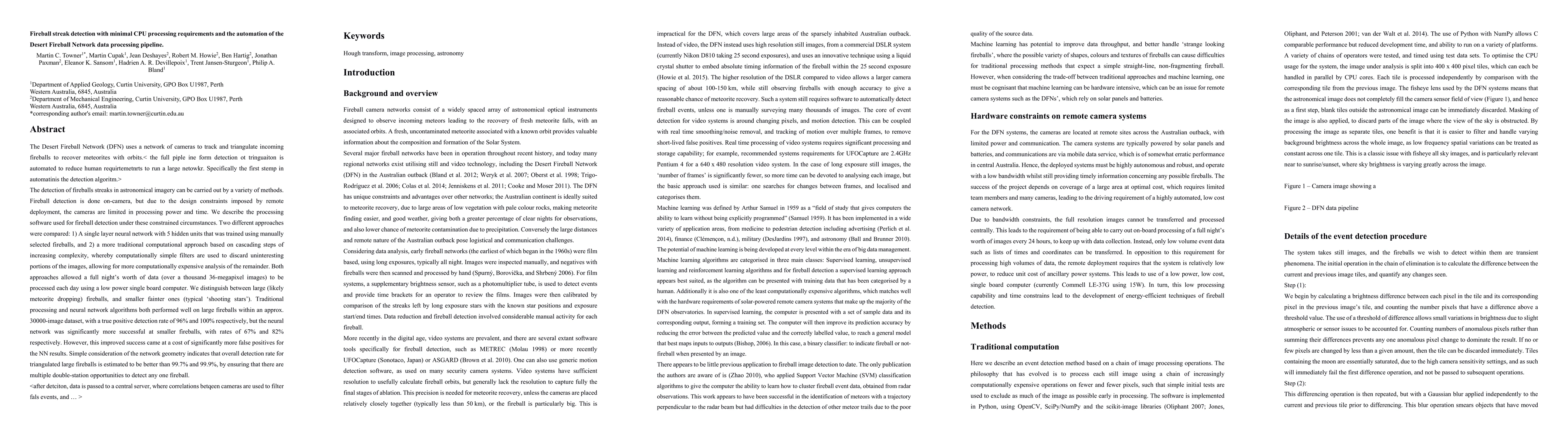 The detection of fireballs streaks in astronomical imagery can be carried out by a variety of methods. The Desert Fireball Network--DFN--uses a network of cameras to track and triangulate incoming fireballs to recover meteorites with orbits. Fireball detection is done on-camera, but due to the design constraints imposed by remote deployment, the cameras are limited in processing power and time. We describe the processing software used for fireball detection under these constrained circumstances. A cascading approach was implemented, whereby computationally simple filters are used to discard uninteresting portions of the images, allowing for more computationally expensive analysis of the remainder. This allows a full night's worth of data; over 1000 36 megapixel images to be processed each day using a low power single board computer. The algorithms chosen give a single camera successful detection large fireball rate of better than 96 percent, when compared to manual inspection, although significant numbers of false positives are generated. The overall network detection rate for triangulated large fireballs is estimated to be better than 99.8 percent, by ensuring that there are multiple double stations chances to detect one fireball.