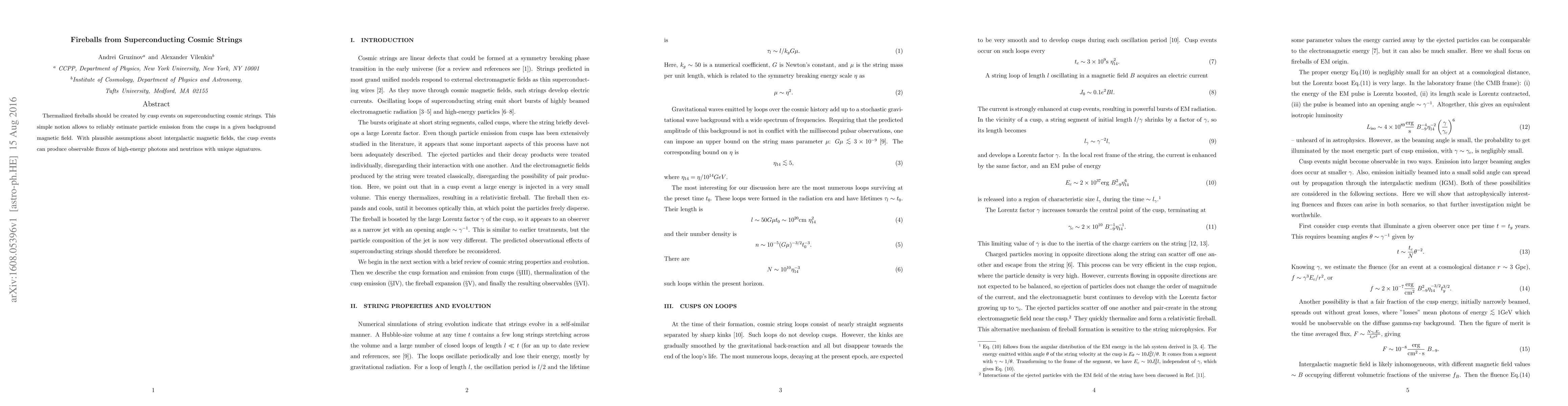 Thermalized fireballs should be created by cusp events on superconducting cosmic strings. This simple notion allows to reliably estimate particle emission from the cusps in a given background magnetic field. With plausible assumptions about intergalactic magnetic fields, the cusp events can produce observable fluxes of high-energy photons and neutrinos with unique signatures.