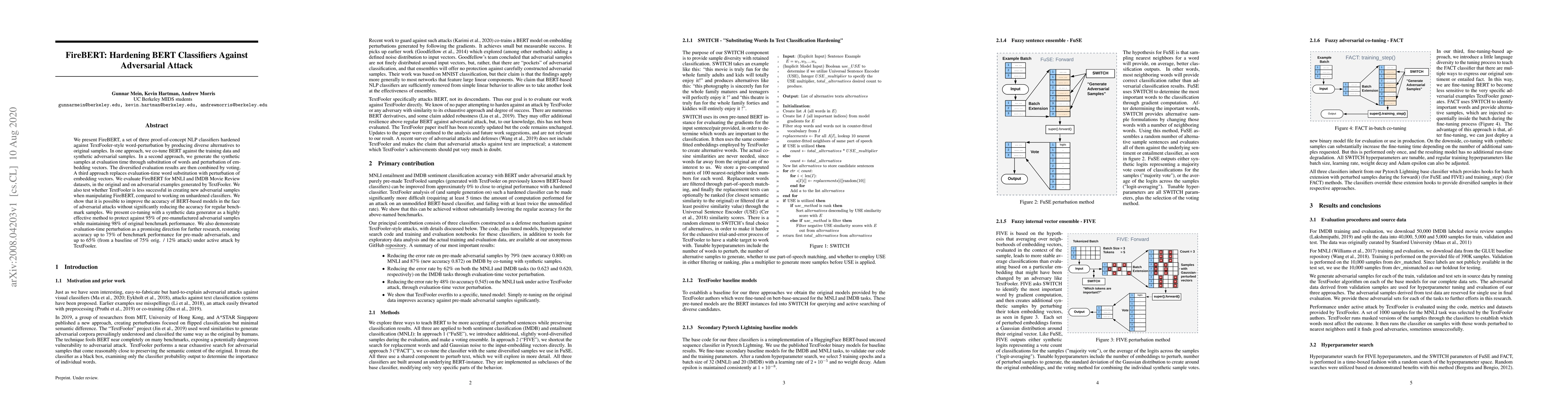 We present FireBERT, a set of three proof-of-concept NLP classifiers hardened against TextFooler-style word-perturbation by producing diverse alternatives to original samples. In one approach, we co-tune BERT against the training data and synthetic adversarial samples. In a second approach, we generate the synthetic samples at evaluation time through substitution of words and perturbation of embedding vectors. The diversified evaluation results are then combined by voting. A third approach replaces evaluation-time word substitution with perturbation of embedding vectors. We evaluate FireBERT for MNLI and IMDB Movie Review datasets, in the original and on adversarial examples generated by TextFooler. We also test whether TextFooler is less successful in creating new adversarial samples when manipulating FireBERT, compared to working on unhardened classifiers. We show that it is possible to improve the accuracy of BERT-based models in the face of adversarial attacks without significantly reducing the accuracy for regular benchmark samples. We present co-tuning with a synthetic data generator as a highly effective method to protect against 95% of pre-manufactured adversarial samples while maintaining 98% of original benchmark performance. We also demonstrate evaluation-time perturbation as a promising direction for further research, restoring accuracy up to 75% of benchmark performance for pre-made adversarials, and up to 65% (from a baseline of 75% orig. / 12% attack) under active attack by TextFooler.