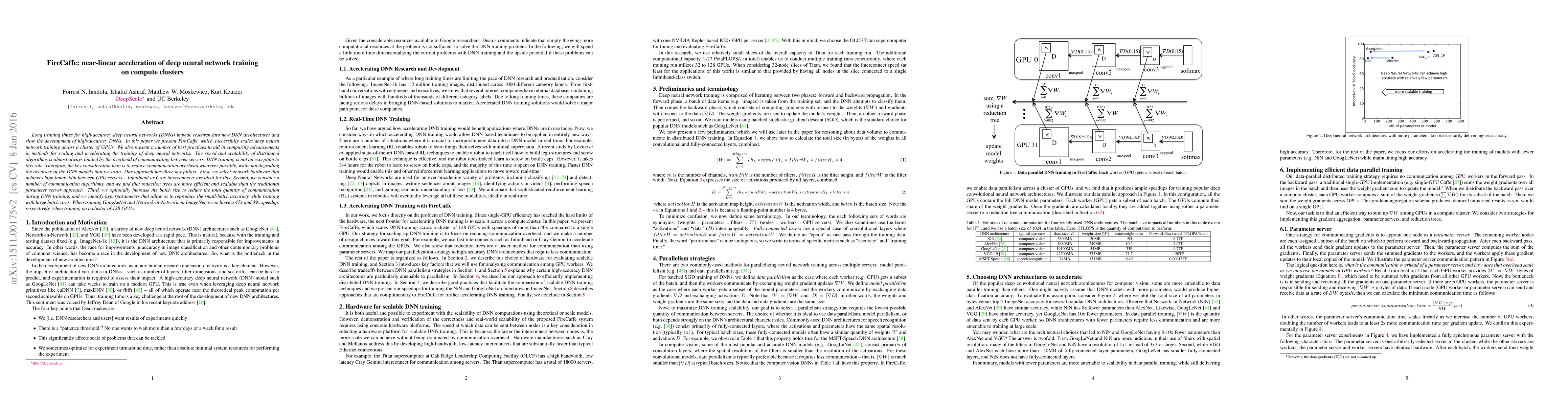 FireCaffe accelerates deep neural network training on GPU clusters by minimizing communication overhead through high-bandwidth network hardware, efficient reduction trees, and large batch sizes, achieving up to 47x speedup for GoogLeNet on ImageNet. The paper also outlines best practices for comparing distributed training methods.