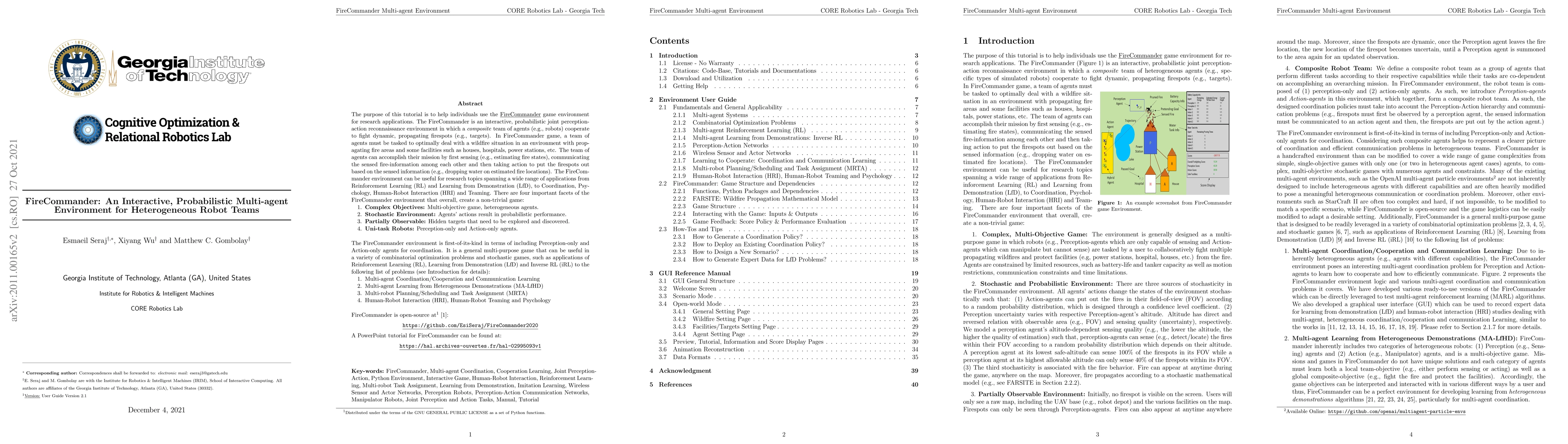 The purpose of this tutorial is to help individuals use the \underline{FireCommander} game environment for research applications. The FireCommander is an interactive, probabilistic joint perception-action reconnaissance environment in which a composite team of agents (e.g., robots) cooperate to fight dynamic, propagating firespots (e.g., targets). In FireCommander game, a team of agents must be tasked to optimally deal with a wildfire situation in an environment with propagating fire areas and some facilities such as houses, hospitals, power stations, etc. The team of agents can accomplish their mission by first sensing (e.g., estimating fire states), communicating the sensed fire-information among each other and then taking action to put the firespots out based on the sensed information (e.g., dropping water on estimated fire locations). The FireCommander environment can be useful for research topics spanning a wide range of applications from Reinforcement Learning (RL) and Learning from Demonstration (LfD), to Coordination, Psychology, Human-Robot Interaction (HRI) and Teaming. There are four important facets of the FireCommander environment that overall, create a non-trivial game: (1) Complex Objectives: Multi-objective Stochastic Environment, (2)Probabilistic Environment: Agents' actions result in probabilistic performance, (3) Hidden Targets: Partially Observable Environment and, (4) Uni-task Robots: Perception-only and Action-only agents. The FireCommander environment is first-of-its-kind in terms of including Perception-only and Action-only agents for coordination. It is a general multi-purpose game that can be useful in a variety of combinatorial optimization problems and stochastic games, such as applications of Reinforcement Learning (RL), Learning from Demonstration (LfD) and Inverse RL (iRL).