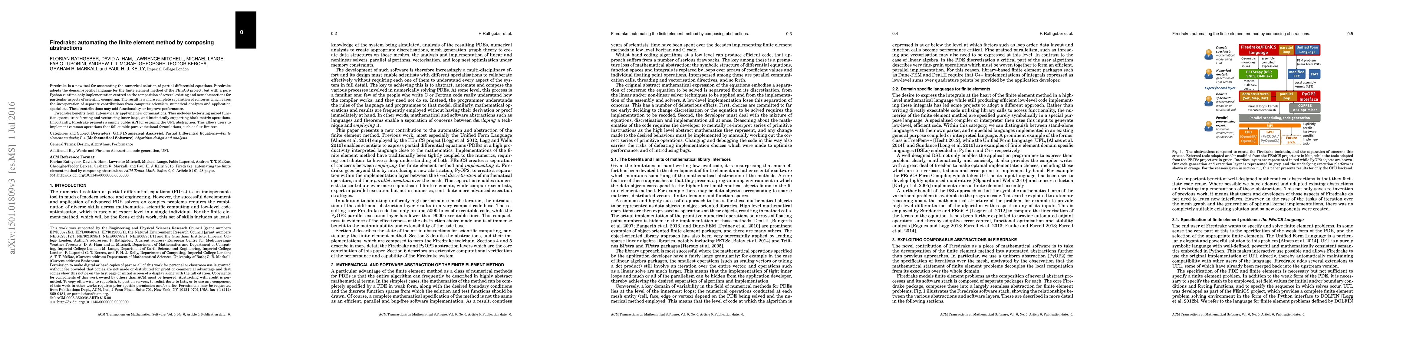 Firedrake automates the finite element method through the composition of abstractions, offering a pure Python runtime for the FEniCS project's domain-specific language. It facilitates contributions from various scientific fields and automatically applies optimizations like factorizing mixed function spaces and vectorizing inner loops.