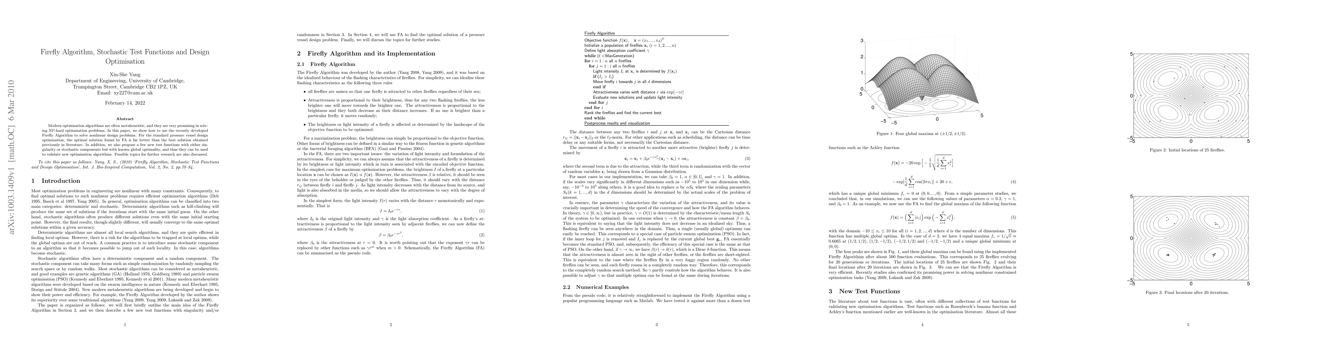 The paper introduces new test functions with singularities and stochastic components, providing a valuable resource for the validation of optimization algorithms, and demonstrates the effectiveness of the Firefly Algorithm in solving design optimization problems.