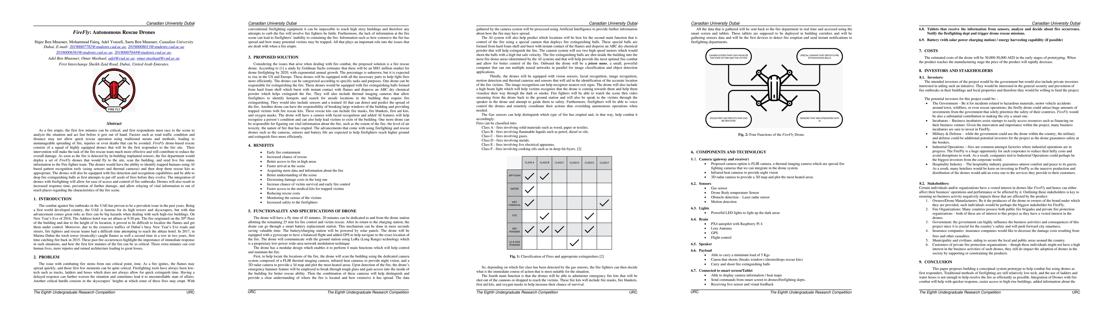 As a fire erupts, the first few minutes can be critical, and first respondents must race to the scene to analyze the situation and act fast before it gets out of hand. Factors such as road traffic condition and distance may not allow quick rescue operation using traditional means and methods, leading to unmanageable spreading of fire, injuries or even deaths that can be avoided. FireFly drone-based rescue consists of a squad of highly equipped drones that will be the first responders to the fire site. Their intervention will make the task of the fire rescue team much more effective and will contribute to reduce the overall damage. As soon as the fire is detected by in-building implanted sensors, the fire department would deploy a set of FireFly drones that would fly to the site, scan the building, and send live fire status information to the Fire fighter team. The drones would have the ability to identify trapped humans using AI based pattern recognition tools (using sensors and thermal cameras) and then drop them rescue kits as appropriate. The drones will also be equipped with fire detection and recognition capabilities and be able to drop fire extinguishing balls as first attempts to put off seeds of fires before they evolve. The integration of drones with firefighting will allow for ease of access and control of fire outbreaks. Drones will also result in increased response time, prevention of further damage, and allow relaying of vital information to out of reach places regarding the characteristics of the fire scene.