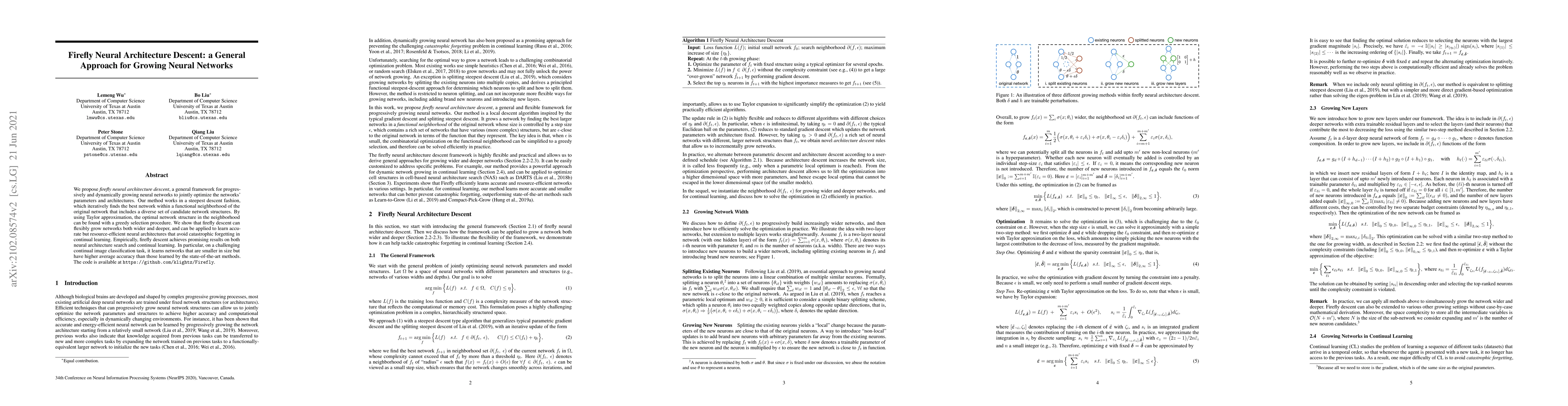 Firefly Neural Architecture Descent is a framework for dynamically growing neural networks by optimizing both parameters and architectures. It employs a steepest descent approach to iteratively find optimal network structures, achieving resource-efficient and accurate models while avoiding catastrophic forgetting in continual learning.