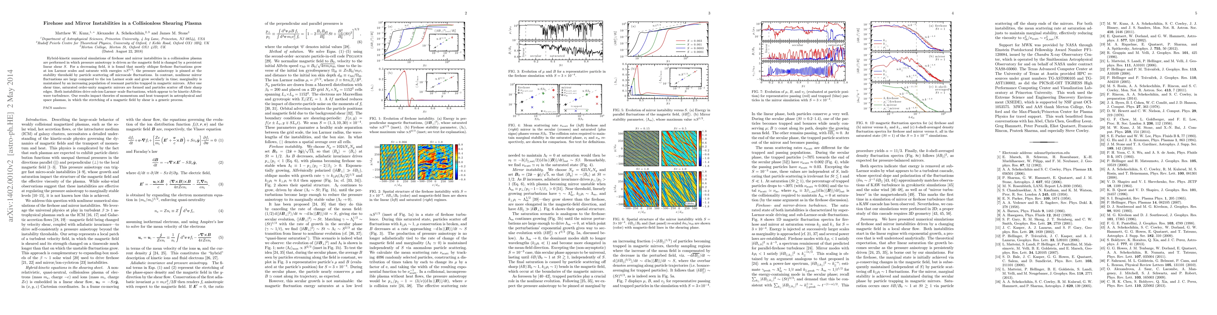 Hybrid-kinetic numerical simulations of firehose and mirror instabilities in a collisionless plasma are performed in which pressure anisotropy is driven as the magnetic field is changed by a persistent linear shear $S$. For a decreasing field, it is found that mostly oblique firehose fluctuations grow at ion Larmor scales and saturate with energies $\sim$$S^{1/2}$; the pressure anisotropy is pinned at the stability threshold by particle scattering off microscale fluctuations. In contrast, nonlinear mirror fluctuations are large compared to the ion Larmor scale and grow secularly in time; marginality is maintained by an increasing population of resonant particles trapped in magnetic mirrors. After one shear time, saturated order-unity magnetic mirrors are formed and particles scatter off their sharp edges. Both instabilities drive sub-ion-Larmor--scale fluctuations, which appear to be kinetic-Alfv\'{e}n-wave turbulence. Our results impact theories of momentum and heat transport in astrophysical and space plasmas, in which the stretching of a magnetic field by shear is a generic process.