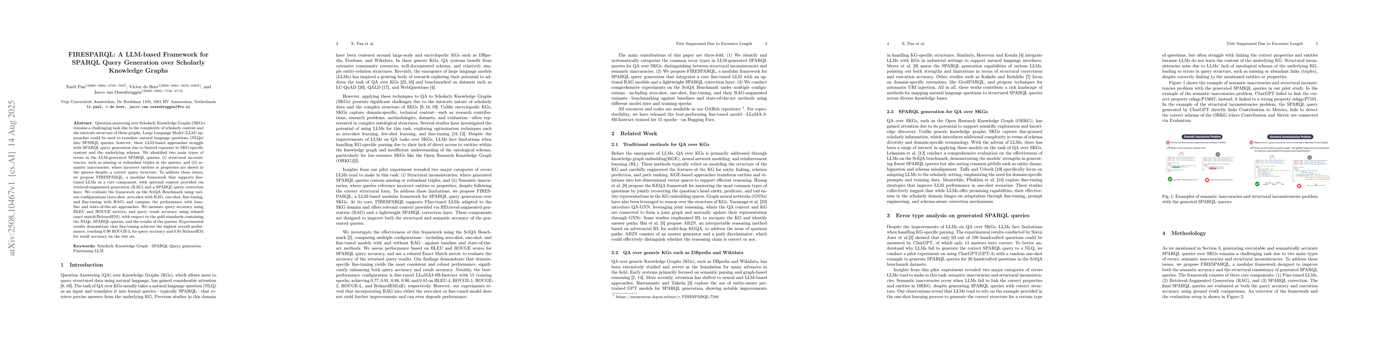 Question answering over Scholarly Knowledge Graphs (SKGs) remains a challenging task due to the complexity of scholarly content and the intricate structure of these graphs. Large Language Model (LLM) approaches could be used to translate natural language questions (NLQs) into SPARQL queries; however, these LLM-based approaches struggle with SPARQL query generation due to limited exposure to SKG-specific content and the underlying schema. We identified two main types of errors in the LLM-generated SPARQL queries: (i) structural inconsistencies, such as missing or redundant triples in the queries, and (ii) semantic inaccuracies, where incorrect entities or properties are shown in the queries despite a correct query structure. To address these issues, we propose FIRESPARQL, a modular framework that supports fine-tuned LLMs as a core component, with optional context provided via retrieval-augmented generation (RAG) and a SPARQL query correction layer. We evaluate the framework on the SciQA Benchmark using various configurations (zero-shot, zero-shot with RAG, one-shot, fine-tuning, and fine-tuning with RAG) and compare the performance with baseline and state-of-the-art approaches. We measure query accuracy using BLEU and ROUGE metrics, and query result accuracy using relaxed exact match(RelaxedEM), with respect to the gold standards containing the NLQs, SPARQL queries, and the results of the queries. Experimental results demonstrate that fine-tuning achieves the highest overall performance, reaching 0.90 ROUGE-L for query accuracy and 0.85 RelaxedEM for result accuracy on the test set.