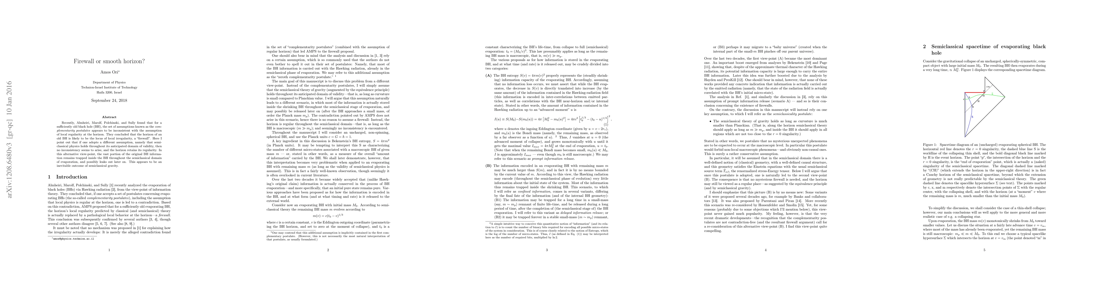 Recently, Almheiri, Marolf, Polchinski, and Sully found that for a sufficiently old black hole (BH), the set of assumptions known as the \emph{complementarity postulates} appears to be inconsistent with the assumption of local regularity at the horizon. They concluded that the horizon of an old BH is likely to be the locus of local irregularity, a "firewall". Here I point out that if one adopts a different assumption, namely that semiclassical physics holds throughout its anticipated domain of validity, then no inconsistency seems to arise, and the horizon retains its regularity. In this alternative view-point, the vast portion of the original BH information remains trapped inside the BH throughout the semiclassical domain of evaporation, and possibly leaks out later on. This appears to be an inevitable outcome of semiclassical gravity.