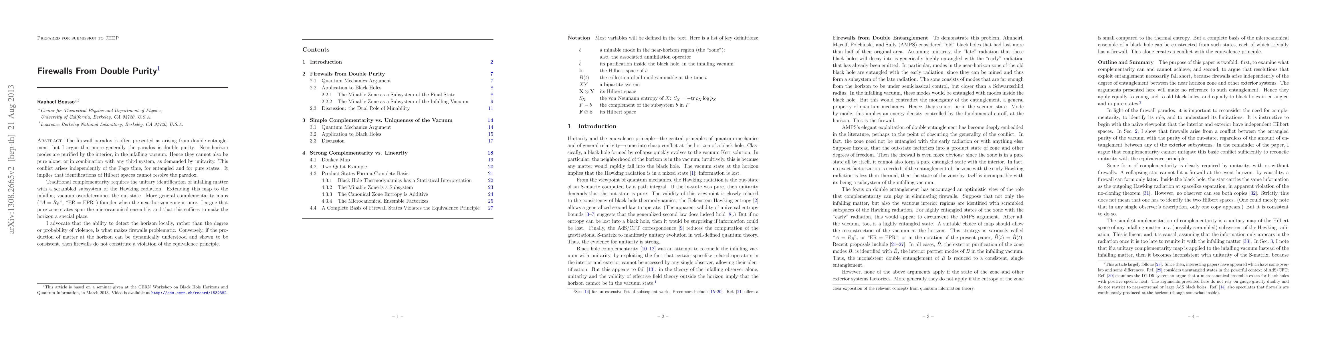 The firewall paradox is often presented as arising from double entanglement, but I argue that more generally the paradox is double purity. Near-horizon modes are purified by the interior, in the infalling vacuum. Hence they cannot also be pure alone, or in combination with any third system, as demanded by unitarity. This conflict arises independently of the Page time, for entangled and for pure states. It implies that identifications of Hilbert spaces cannot resolve the paradox. Traditional complementarity requires the unitary identification of infalling matter with a scrambled subsystem of the Hawking radiation. Extending this map to the infalling vacuum overdetermines the out-state. More general complementarity maps ("A=R_B", "ER=EPR") founder when the near-horizon zone is pure. I argue that pure-zone states span the microcanonical ensemble, and that this suffices to make the horizon a special place. I advocate that the ability to detect the horizon locally, rather than the degree or probability of violence, is what makes firewalls problematic. Conversely, if the production of matter at the horizon can be dynamically understood and shown to be consistent, then firewalls do not constitute a violation of the equivalence principle.